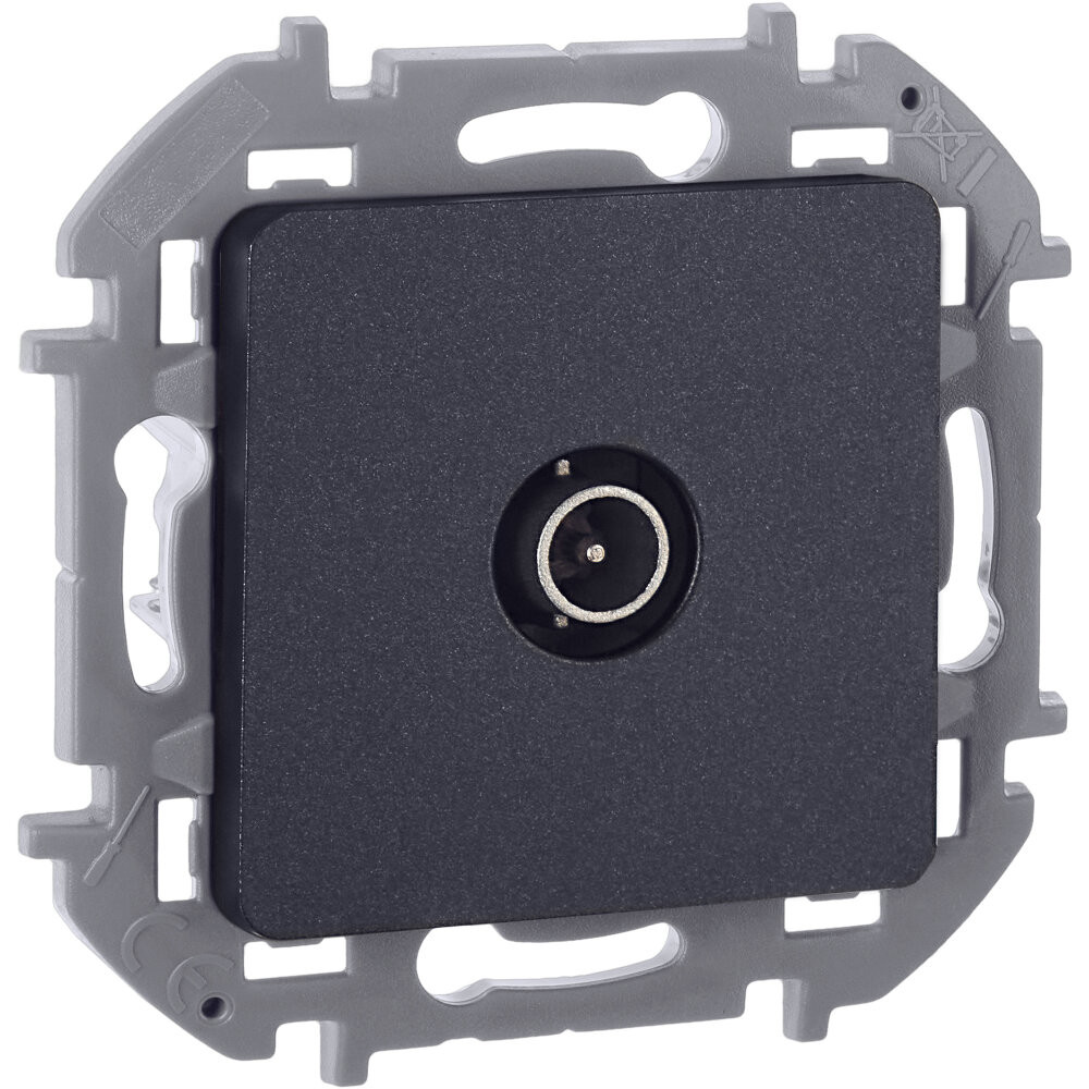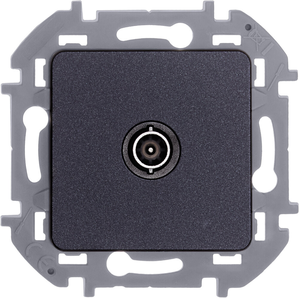 Розетка телевизионная для скрытого монтажа Inspiria, оконечная для схемы ''шлейф'', затухание 10дБ, 4-862МГц, цвет ''Антрацит''. Предназначена для подключения нескольких ТВ приемников к антенне, используется в схеме ''шлейф'' и устанавливается в конце линии.