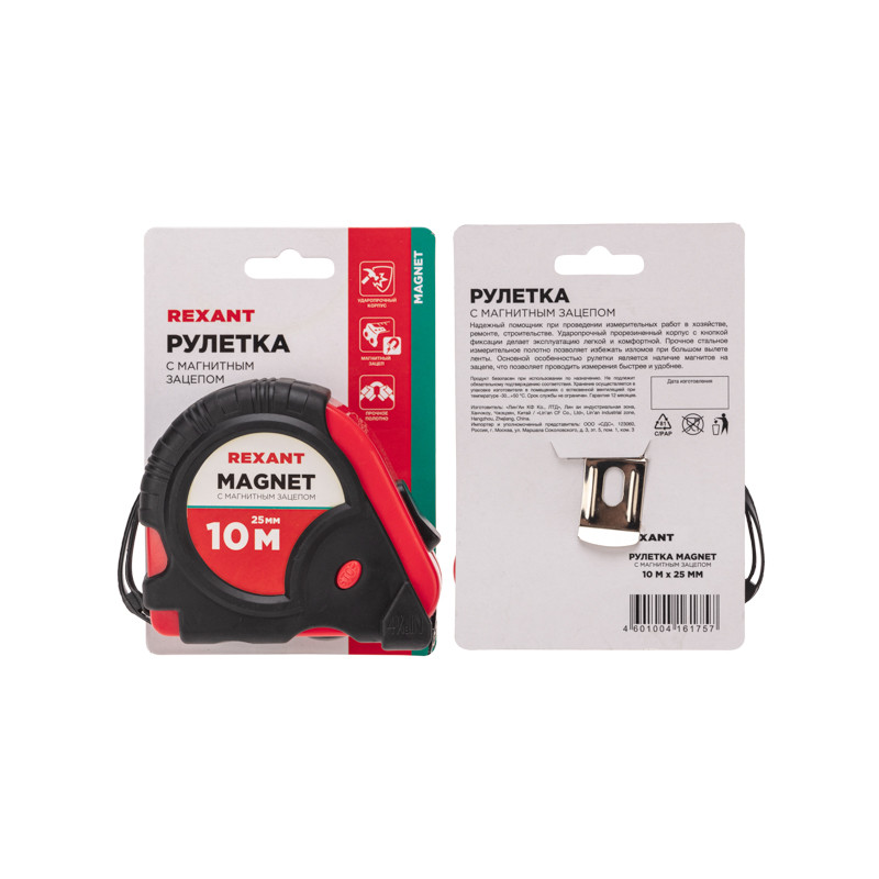 Рулетка измерительная прорезиненный корпус, магнитная , 10 м х 25 мм (REXANT) 12-9017