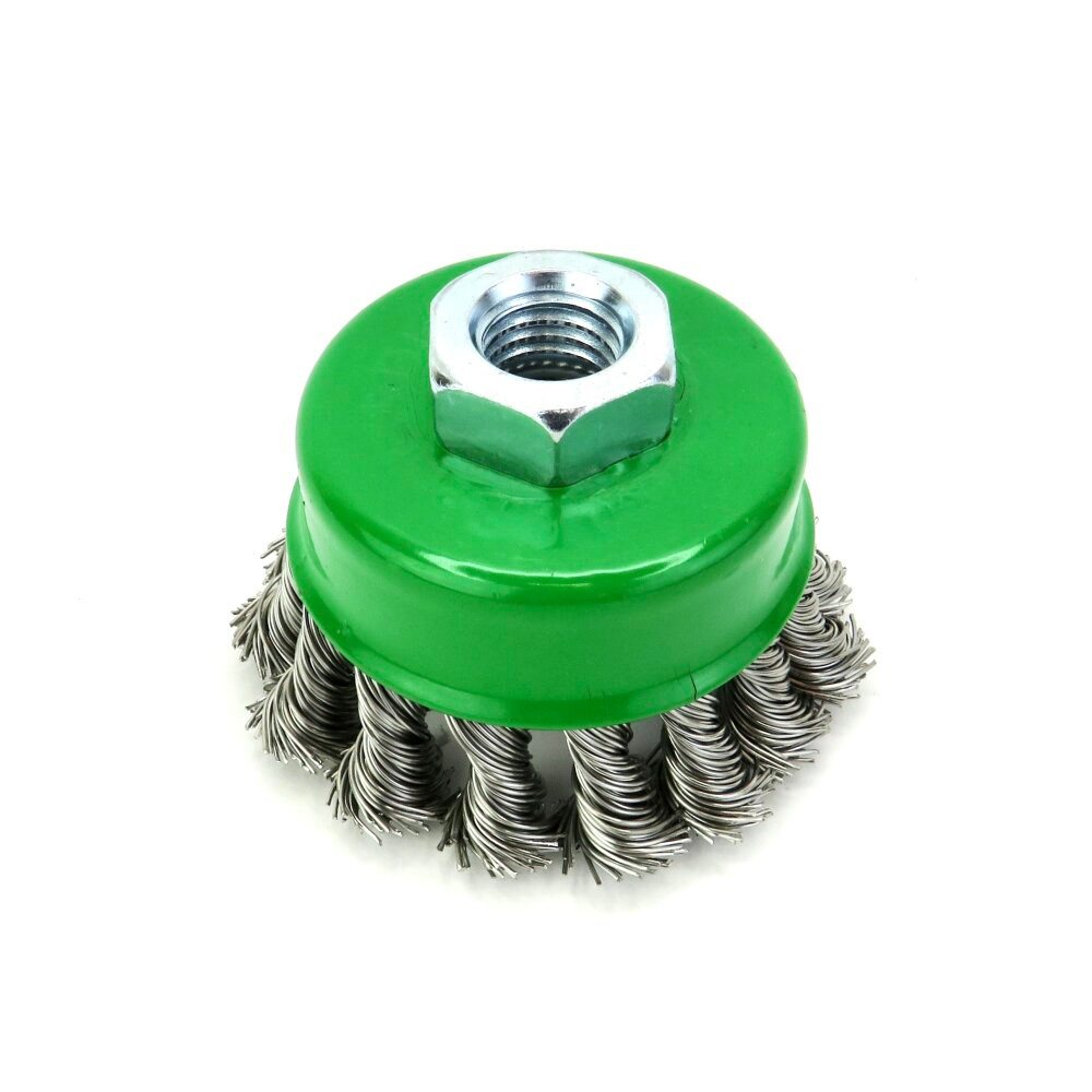 Щетки чашечные разного диаметра (65, 75, 100 мм) с посадкой М14 на УШМ (Болгарка) для тяжелых зачистных работ по изделиям из нержавеющих сталей и цветных металлов. Выполняют агрессивную и эффективную зачистку благодаря скрученной в жесткие жгуты стальной проволоки. Обрабатываемый материал - нержавеющая сталь, алюминий, цветные металлы. Электроинструменты / станки - для УШМ (болгарка) / на 115 мм и более. Диаметр D, Д (мм) - 65. Размер A, E (мм) - 13. Размер T, S (мм) - 14. Посадочный диаметр B, G, F (мм) - М14 (шаг 2,00). Материал ворса щетки - сталь нержавеющая. Диаметр ворса (мм) - 0,50. Тип (форма) ворса - жгутовой (витой, скрученный в жгуты). Количество жгутов (шт) - 16. Максимальная скорость (об/мин) - 12500.