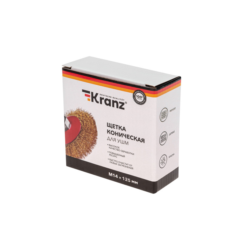 Коническая щетка KRANZ применяется совместно с угловой шлифовальной машиной с целью очистки разнообразных металлических деталей и заготовок от слоя краски, лака, заусенцев, ржавчины, окалины или нагара. Подходит для обработки и выравнивания сварочных швов на стальных поверхностях. Витая щетина из латунированной проволоки оптимально подходит для аккуратной обработки и шлифовки, позволяет удалить тонкий слой материала, а также придать поверхности глянцевый блеск. Латунированная проволока имеет высокую устойчивость к коррозии, а при работе возникает меньше искр. Коническая форма щетки позволяет легко достигать труднодоступных участков и обрабатывать поверхности различных форм и размеров. Тип соединения М14 обеспечивает простоту и надежность установки на УШМ. Инструмент соответствует действующим стандартам качества и подходит для использования в условиях интенсивного и сложного труда.