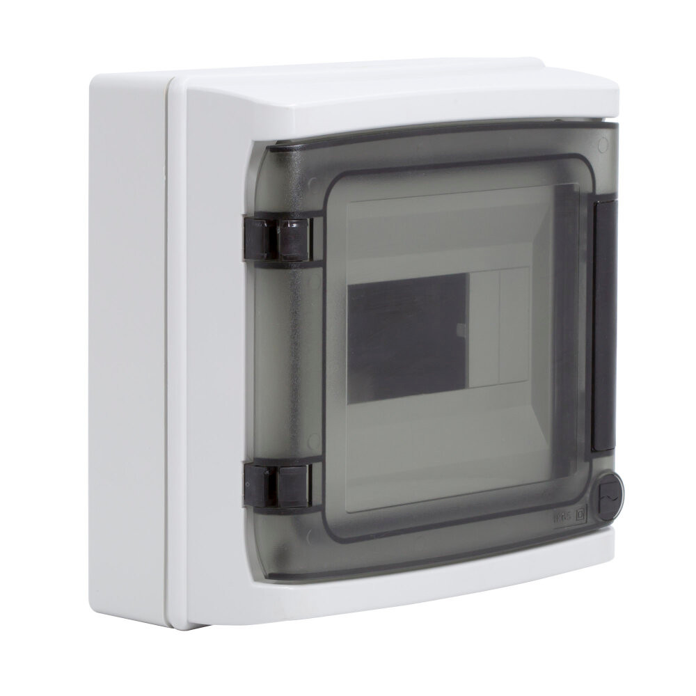Настенный модульный щиток с прозрачной затемненной дверцей. Предназначен для монтажа в жилых и административных помещениях для установки автоматических выключателей любых производителей: таймеров, устройств защитного отключения и управления освещением и т.д. В комплект поставки входят: клеммные блоки 2 x (7x16мм2), ручка на дверце, оцинкованная DIN-рейка, заглушки для пустых модулей, заглушки на пазы для крепления к стене, сборочные винты. Степень пыле- и влагозащиты IP 65. Ударопрочность корпуса IK09. Количество модулей - 8. Параметры щитка: ширина - 215 мм, высота - 210 мм, глубина - 100 мм. Материал - термостойкий пластик. Цвет - серый.