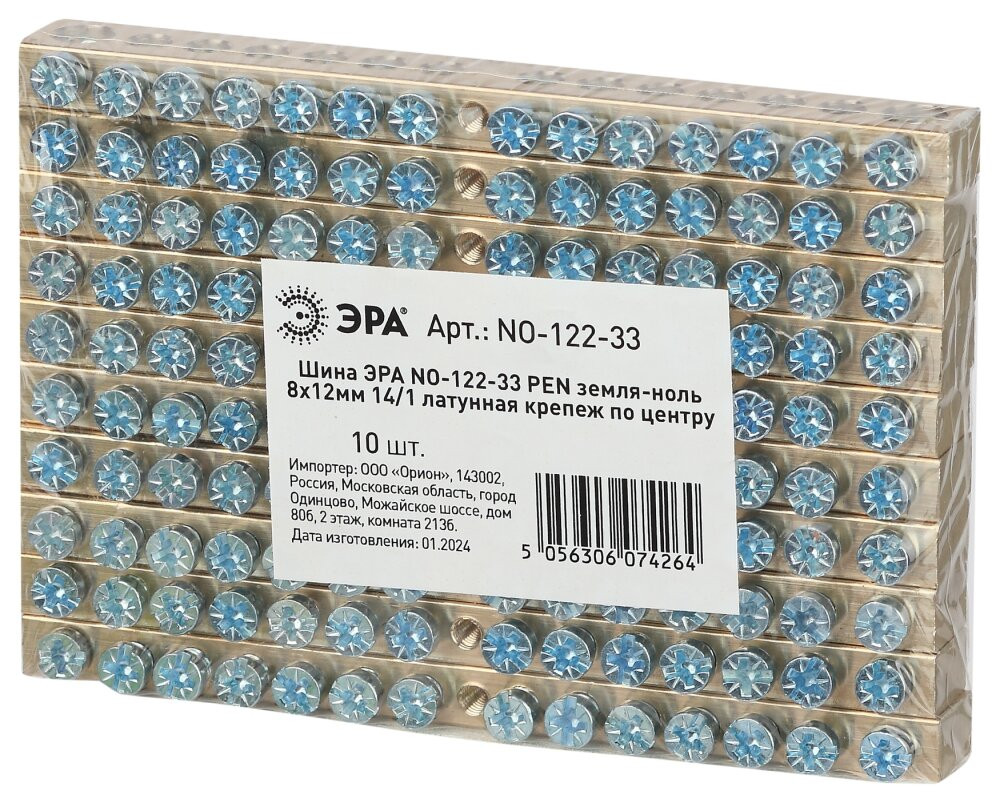Полное описание товара Шина NO-122-33 PEN земля-ноль 8х12мм 14/1 латунная крепеж по центру (ЭРА) Б0047248