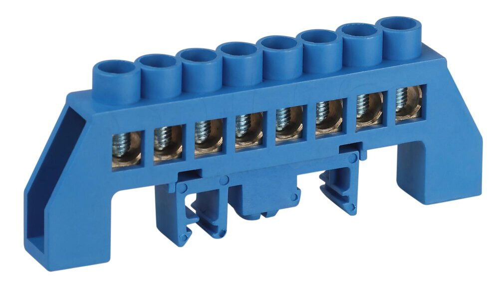 Нулевые шины N предназначены для электрического и механического соединения нулевых проводников. Является проводником, который служит для возврата к источнику остатка напряжения в стандартном случае или выравнивания потенциала в трёхфазной сети. Изделие выполнено из латунной шины сечением 8?12 мм установленной в пластиковый комбинированный изолятор синего цвета.