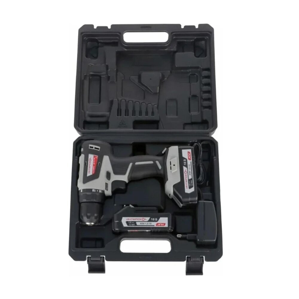 - Комплектация: бесщеточная аккумуляторная дрель-шуруповерт|аккумуляторная батарея БА-18/1,5 емкостью 1,5 А ч единой платформы АПИ 18 В – 2 шт|зарядное устройство ЗУ-1,5/18|кейс|руководство по эксплуатации и инструкция по безопасности