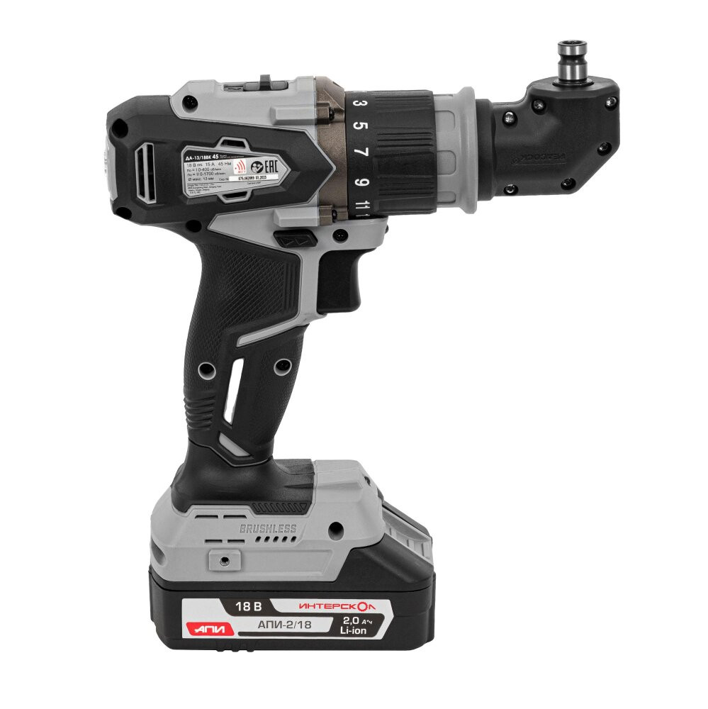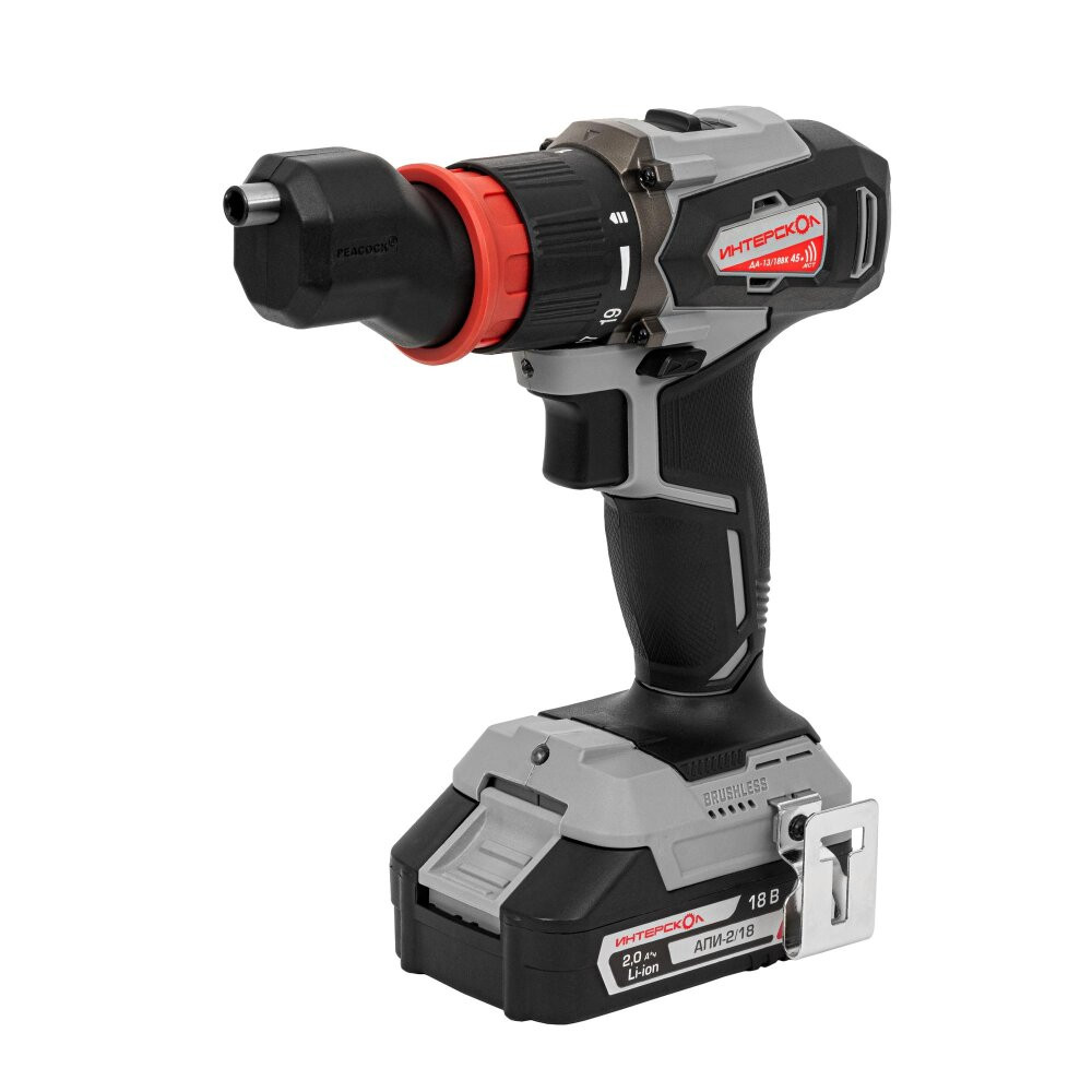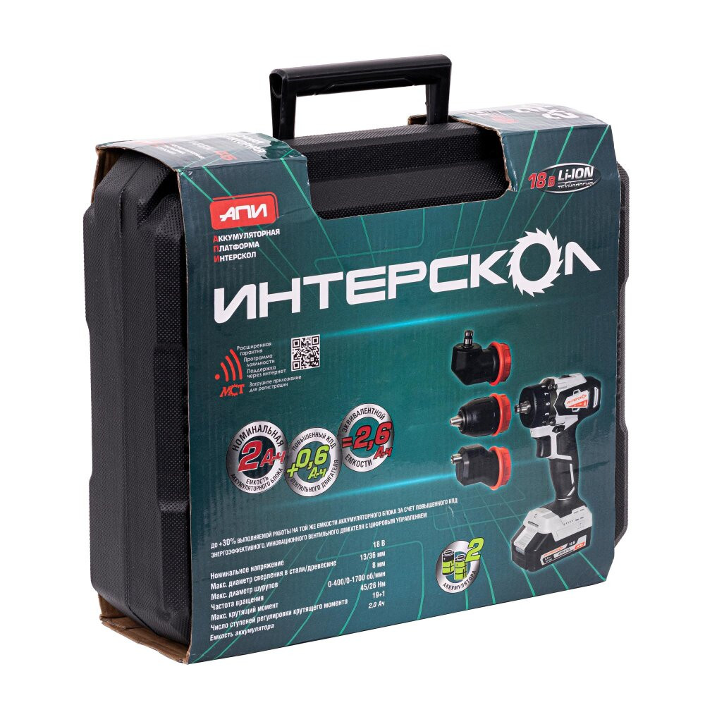 Полное описание товара Шуруповерт аккумуляторный бесщеточный ДА-13/18ВК 45 комби АПИ (Li-ion, кейс, 2 аккум., 2Ач, 3 насадки), (Интерскол) 575.2.2.78