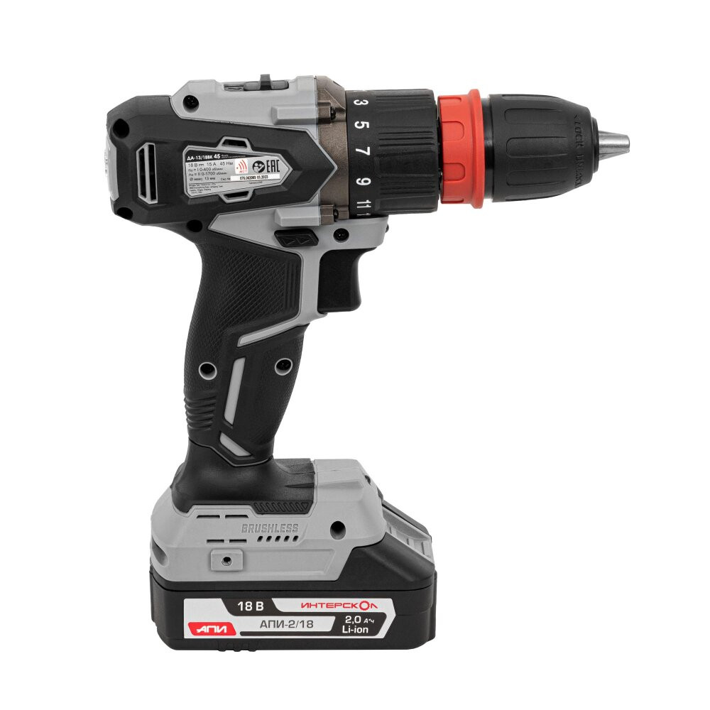 Шуруповерт аккумуляторный бесщеточный ДА-13/18ВК 45 комби АПИ (Li-ion, кейс, 2 аккум., 2Ач, 3 насадки), (Интерскол) 575.2.2.78