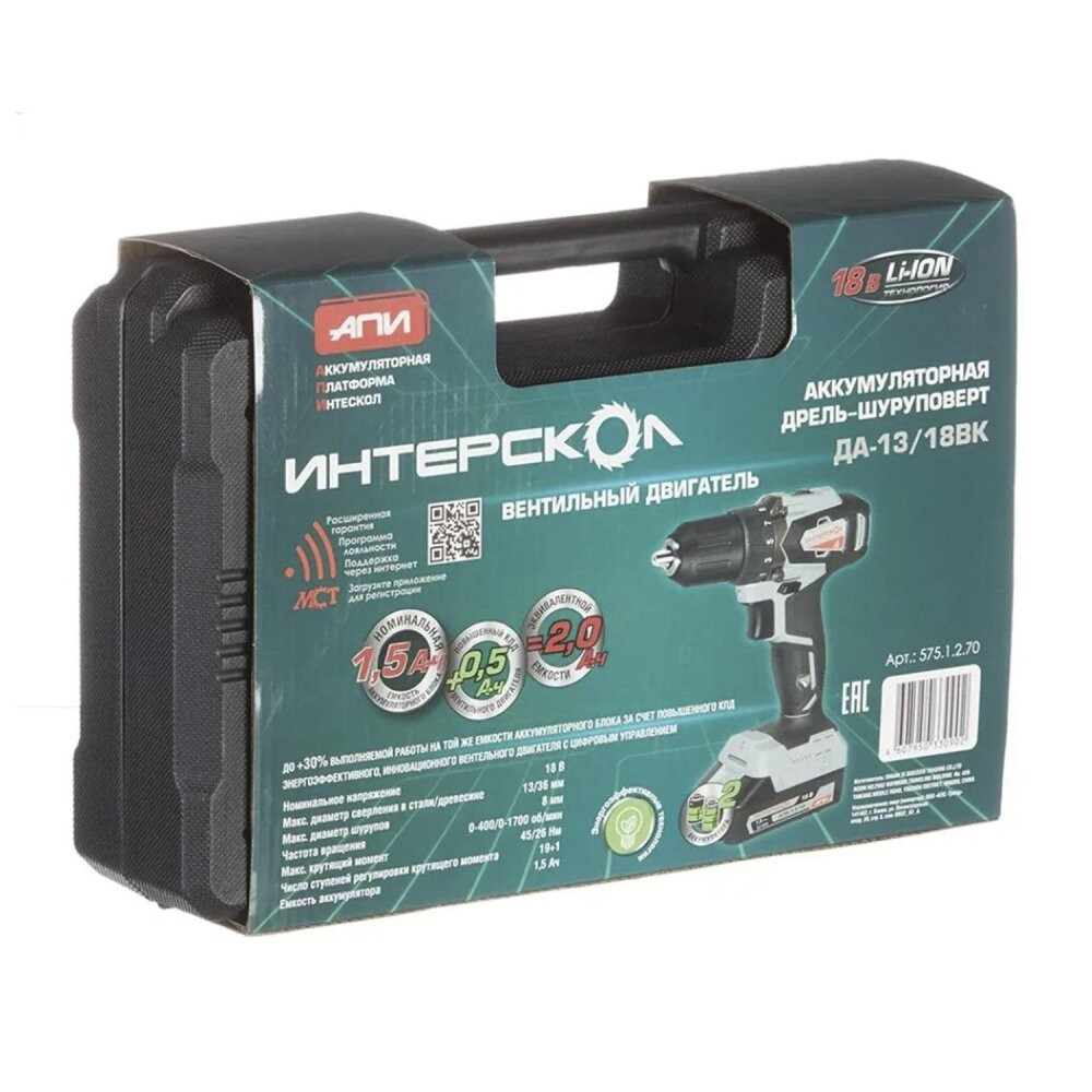 Полное описание товара Шуруповерт аккумуляторный бесщеточный ДА-13/18ВК 45 Li-ion АПИ (кейс, 2 аккум. 1,5Ач, ЗУ), (Интерскол) 575.1.2.70
