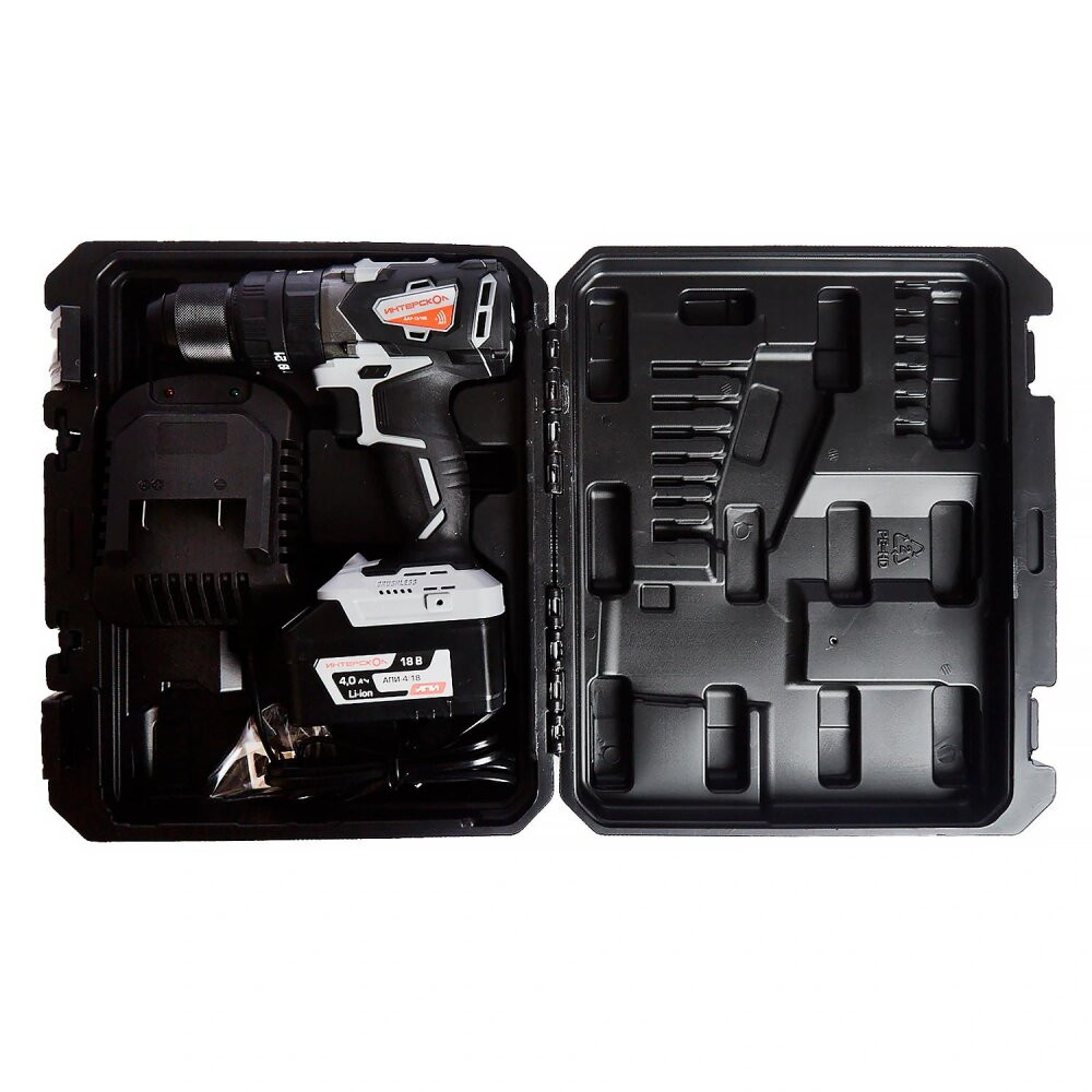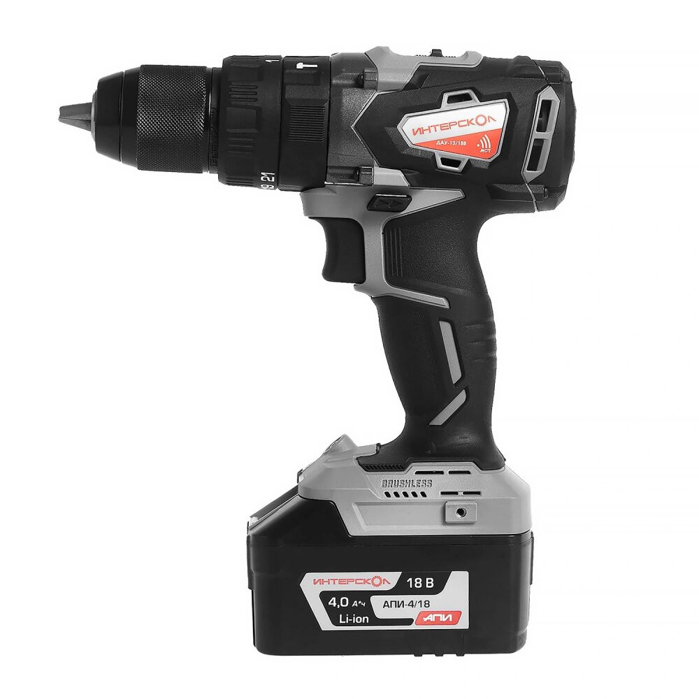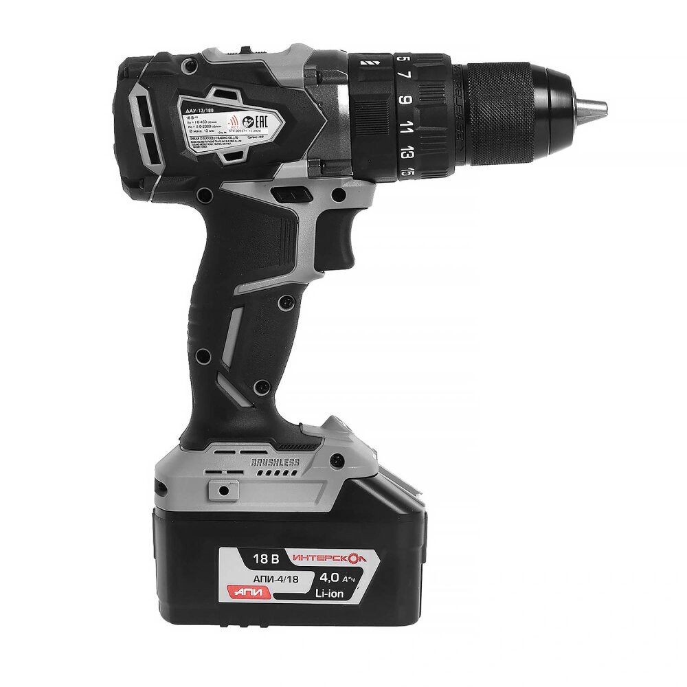Полное описание товара Шуруповерт ударный аккумуляторный бесщеточный ДАУ-13/18В 60Li-ion АПИ (кейс, 1 аккум. 4Ач, ЗУ), (Интерскол) 574.4.1.70