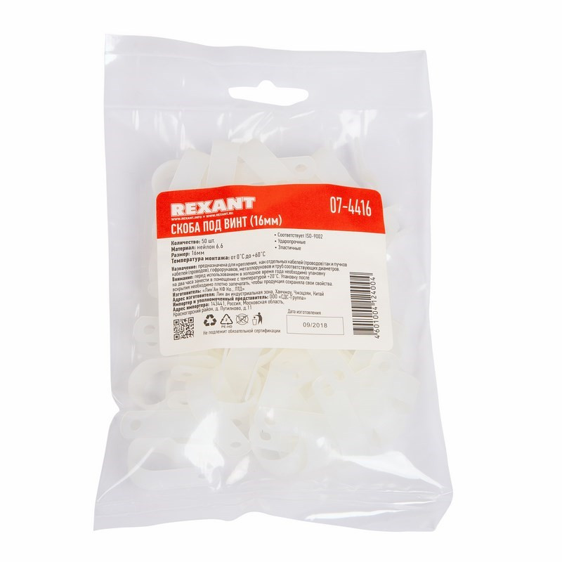 Полное описание товара Скоба кабельная белая под винт 16мм упаковка (50 шт/уп) (REXANT) 07-4416