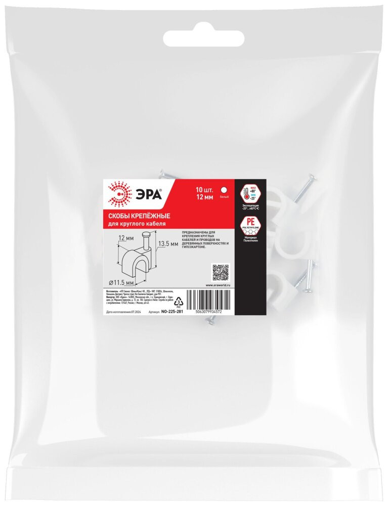 Полное описание товара Скоба пластиковая крепежная круглая 12 мм белая NO-225-281 (10 шт/уп) (ЭРА) Б0066674