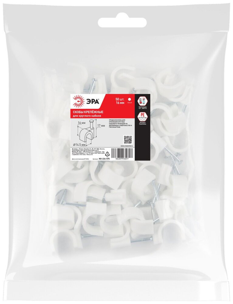 Полное описание товара Скоба пластиковая крепежная круглая 16 мм белая NO-224-575 (50 шт/уп) (ЭРА) Б0066649