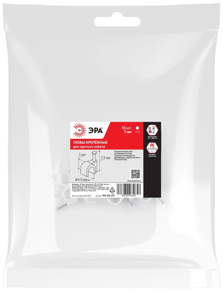Полное описание товара Скоба пластиковая крепежная круглая 7 мм белая NO-225-277 (10 шт/уп) (ЭРА) Б0066670
