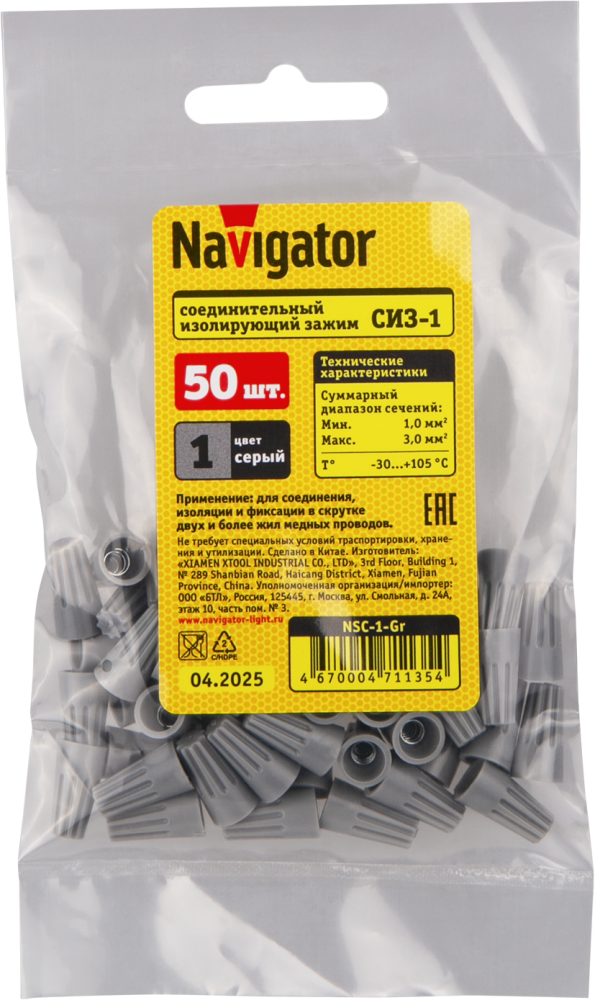 Соединительные изолирующие зажимы (СИЗ) Navigator серии NSC предназначены соединения, изоляции и фиксации в скрутке двух и более жил медных проводов. Зажим навинчивается на предварительно зачищенные и скрученные вместе концы проводов в несколько оборотов до упора, при этом внешний корпус выполняет функцию изоляции.