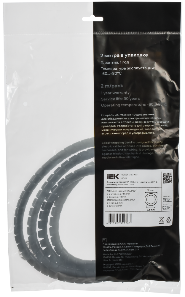 Полное описание товара Спираль монтажная СП-12 черная (2м/упак) IEK (IEK) USWB1-12-02-K02