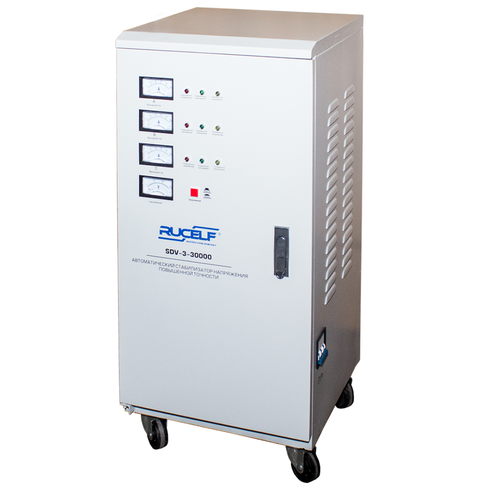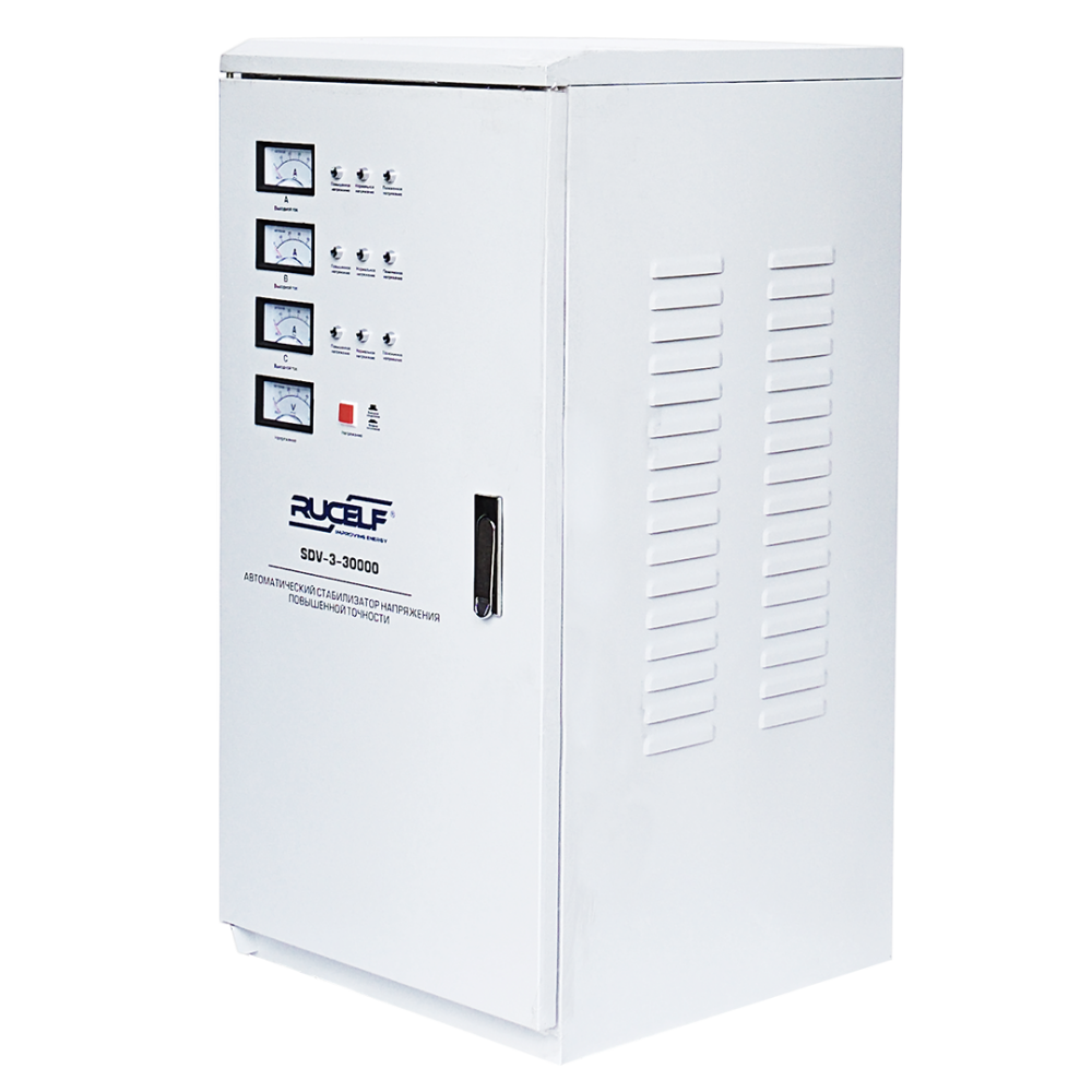 Полное описание товара Стабилизатор напряжения электромеханический трехфазный 30 кВт напольный (RUCELF) SDV-3-30000