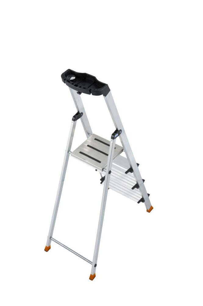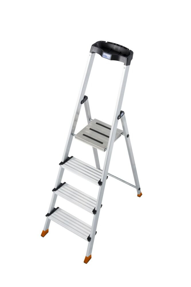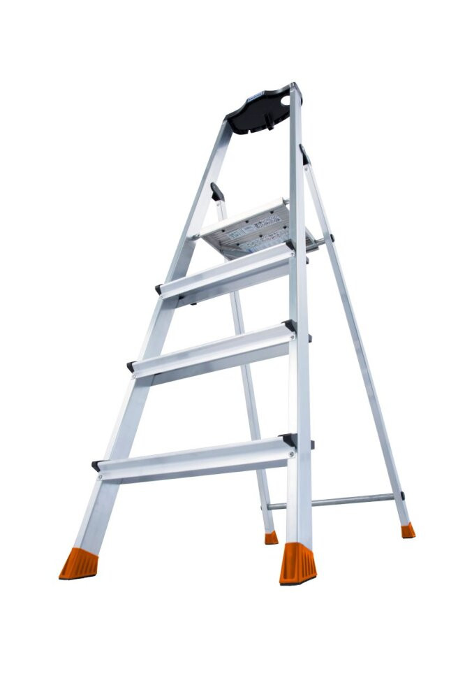 Односторонняя алюминиевая стремянка c высокой дугой безопасности, с большой противоскользящей площадкой. Большая мультифункциональная полка с крючком для ведра, отверстиями для инструмента и эргономичной опорой. Профилированные ступеньки шириной 125 мм для безопасного подъема и удобного положения при работе. Прочное заклепочное соединение ступенек с боковинами. Увеличенные, по сравнению со стандартными, нескользящие опорные наконечники для большей устойчивости. Важным преимуществом являются двухкомпонентные наконечники боковин с резиновым основанием.