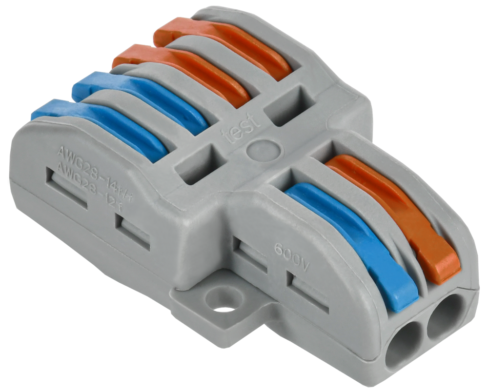 Клемма строительно-монтажная проходная разветвительная серии 222 предназначена для соединения одножильных и многожильных медных проводников без использования инструмента в электрических сетях переменного и постоянного тока. Клемма допускает многократное присоединение и отсоединение проводников. Количество подключаемых проводников - 2/4.