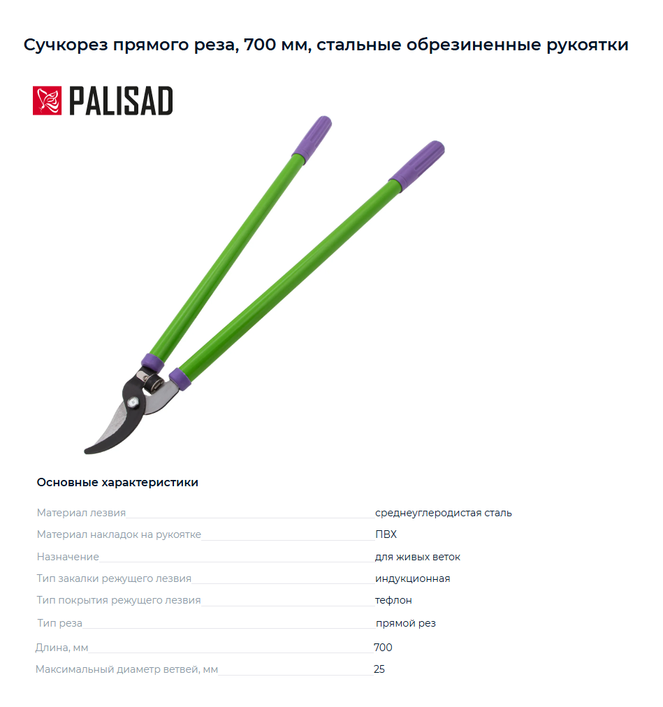- Преимущества: Сучкорез прямого реза Palisad 60521 длиной 700 мм со стальными обрезиненными рукоятками предназначен для срезания живых веток толщиной до 25 мм| Длинные рукоятки позволяют работать со значительным усилием| Закаленное режущее лезвие с прецизионной заточкой, выполненное из среднеуглеродистой стали, облегчает обрезку и долго сохраняет рабочие свойства| Инструмент предназначен для ухода за садом и огородом и будет полезен владельцам дач