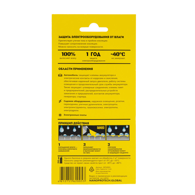 Диэлектрик полностью вытесняет влагу, восстанавливает работу повреждённого влагой электрооборудования без его разборки. Препятствует токоутечке и пробою изоляции. Прочное невидимое нанопокрытие надёжно защитит любую бытовую, промышленную электрику и электронику даже под водой. Многократно продлевает срок эксплуатации устройств и оборудования. Мощная защита минимум на 1 год.