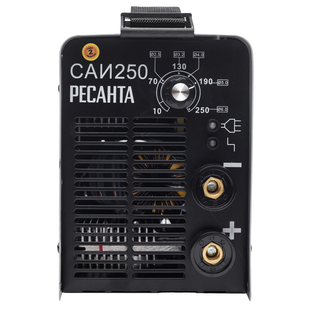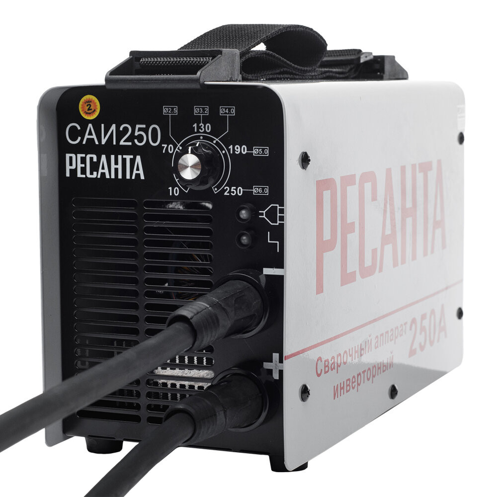 - Преимущества: Сварочный аппарат питается от однофазной сети 140-260 В, 50 Гц|Потребляемая мощность модели Ресанта САИ-250 составляет 9,5 кВА|Сила эффективного потребляемого тока – 38.4А|Сварочный ток можно регулировать в пределах 10-250 А|Диаметр электрода – до 6мм|В сварочнике Ресанта САИ-250 реализованы функции Antistick, ARC FORCE и HOT START – уменьшение силы тока при прилипании электрода, форсаж дуги и увеличение тока на старте|Всё это в совокупности значительно облегчает сварочные работы|Агрегат может эксплуатироваться в сухом, затенённом от солнца месте при температуре окружающей среды от -20 до +50°С и влажности воздуха до 80%.