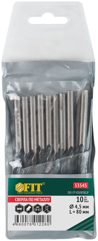 Сверла по металлу HSS черненые 4.5x80 мм (10 шт) (FIT) 33545
