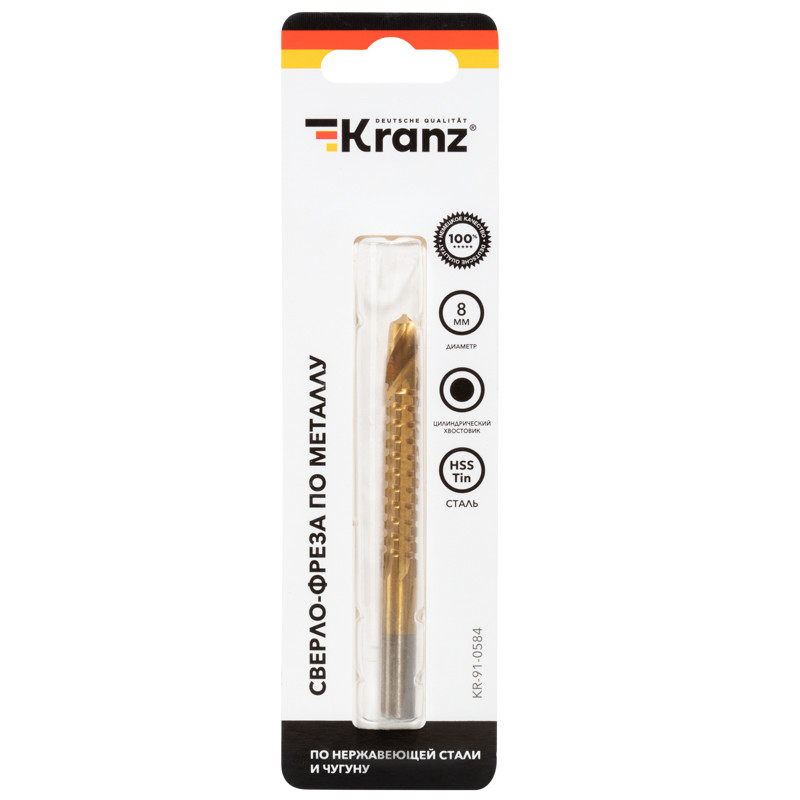 Полное описание товара Сверло-фреза по металлу 8 мм, HSS, титан, цилиндрический хвостовик (Kranz) KR-91-0584