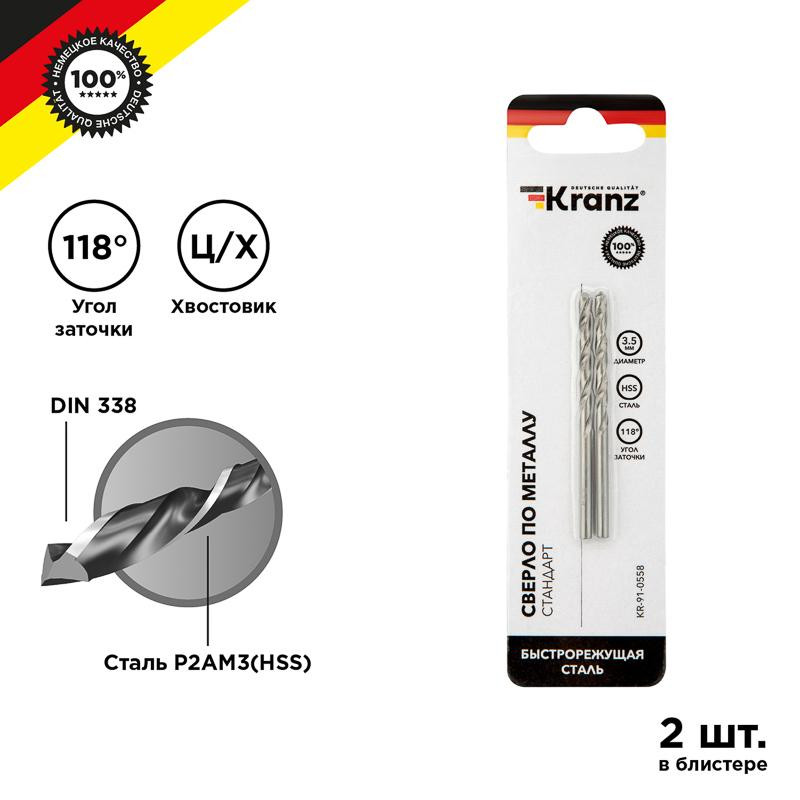 Сверло по металлу 3.5х70х39 мм HSS (упак - 2 шт.) DIN 338 (Kranz) KR-91-0558