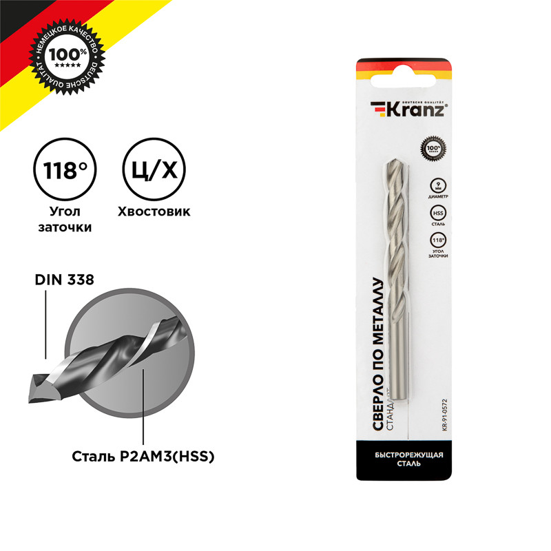 Сверло по металлу 9.0х125х81 мм HSS DIN 338 (Kranz) KR-91-0572