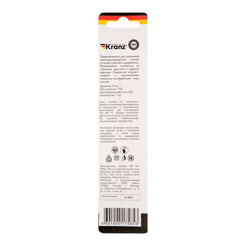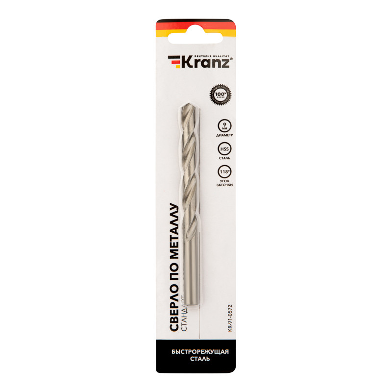 Полное описание товара Сверло по металлу 9.0х125х81 мм HSS DIN 338 (Kranz) KR-91-0572