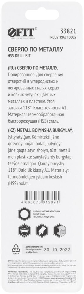Полное описание товара Сверло по металлу HSS полированное в блистере 10,0 мм (FIT) 33821