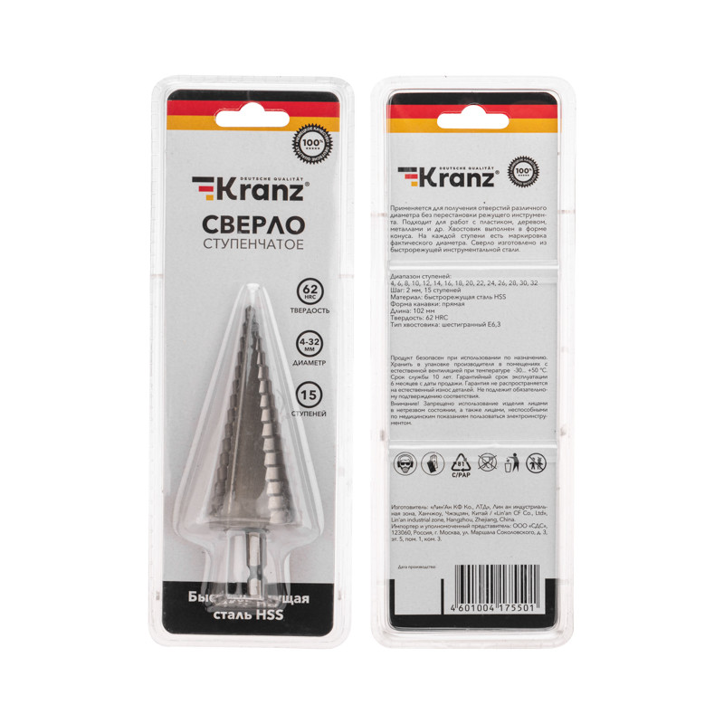 Сверло по металлу ступенчатое 4.0-32.0 мм 102 мм 62 HRC (Kranz) KR-12-6603