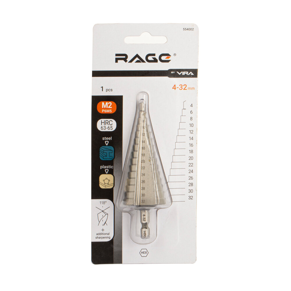 Сверло ступенчатое Р6М5 с шестигранным хвостовиком 4-32 мм (Rage) 554002