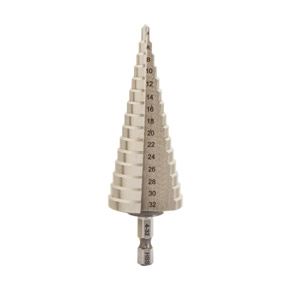 Сверло ступенчатое с шестигранным хвостовиком 1/4 HEX 4-32 мм VIRA предназначено для эффективного сверления тонколистового металла и цветных металлов, твёрдого пластика, древесины без деформаций. Сверло выполнено из высококачественной быстрорежущей легированной стали M2 (Р6М5) твердостью 63-65HRC, которое увеличивает износостойкость инструмента. Надежную фиксацию сверла в патроне инструмента обеспечивает шестигранный хвостовик 1/4 HEX который позволяет устанавливать его не только в электроинструмент с быстрозажимным патроном, но и с патронами типа НЕХ. Благодаря плавному ступенчатому переходу, сверло позволяет выполнять различные по диаметру отверстия (от 4 до 20 мм), не меняя каждый раз оснастку. А также применяется для расширения уже существующих отверстий.