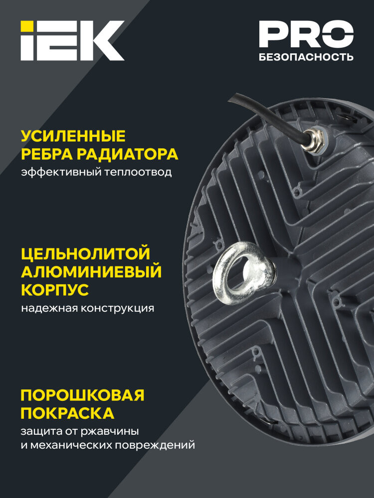 - Преимущества: Высокая эффективность 120 лм/Вт, снижает потребление электроэнергии|Широкий диапазон рабочих температур|Простой монтаж на подвес, компактная конструкция|Порошковая покраска, надежная защита от ржавчины и механических воздействий, сохранение первоначального внешнего вида на протяжении всего срока службы|Закалённое силикатное стекло обеспечивает безопасную эксплуатацию и монтаж|В комплекте рым-болт для удобства установки