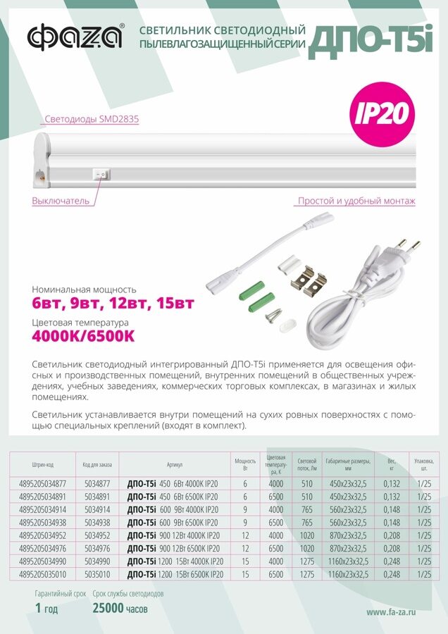 Светодиоды SMD2835 Выключатель Простой и удобный монтаж Светильник светодиодный интегрированный ДПО-T5i применяется для освещения офисных и производственных помещений, внутренних помещений в общественных учреждениях, учебных заведениях, коммерческих торговых комплексах, в магазинах и жилых помещениях. Светильник устанавливается внутри помещений на сухих ровных поверхностях с помощью специальных креплений (входят в комплект).