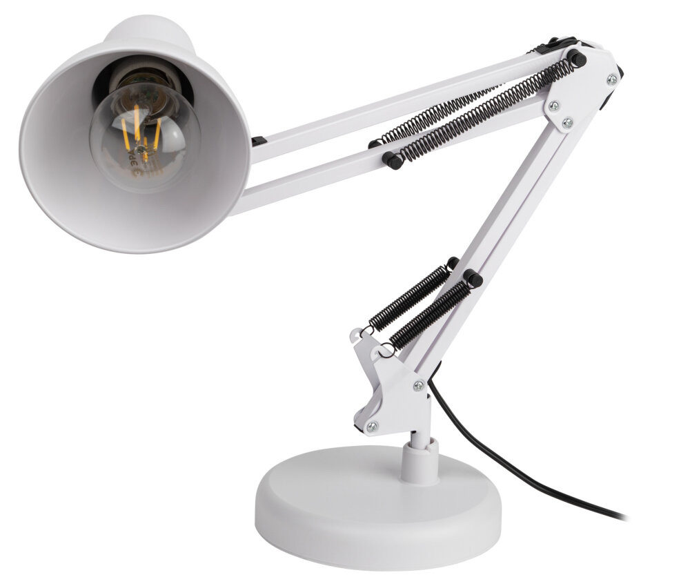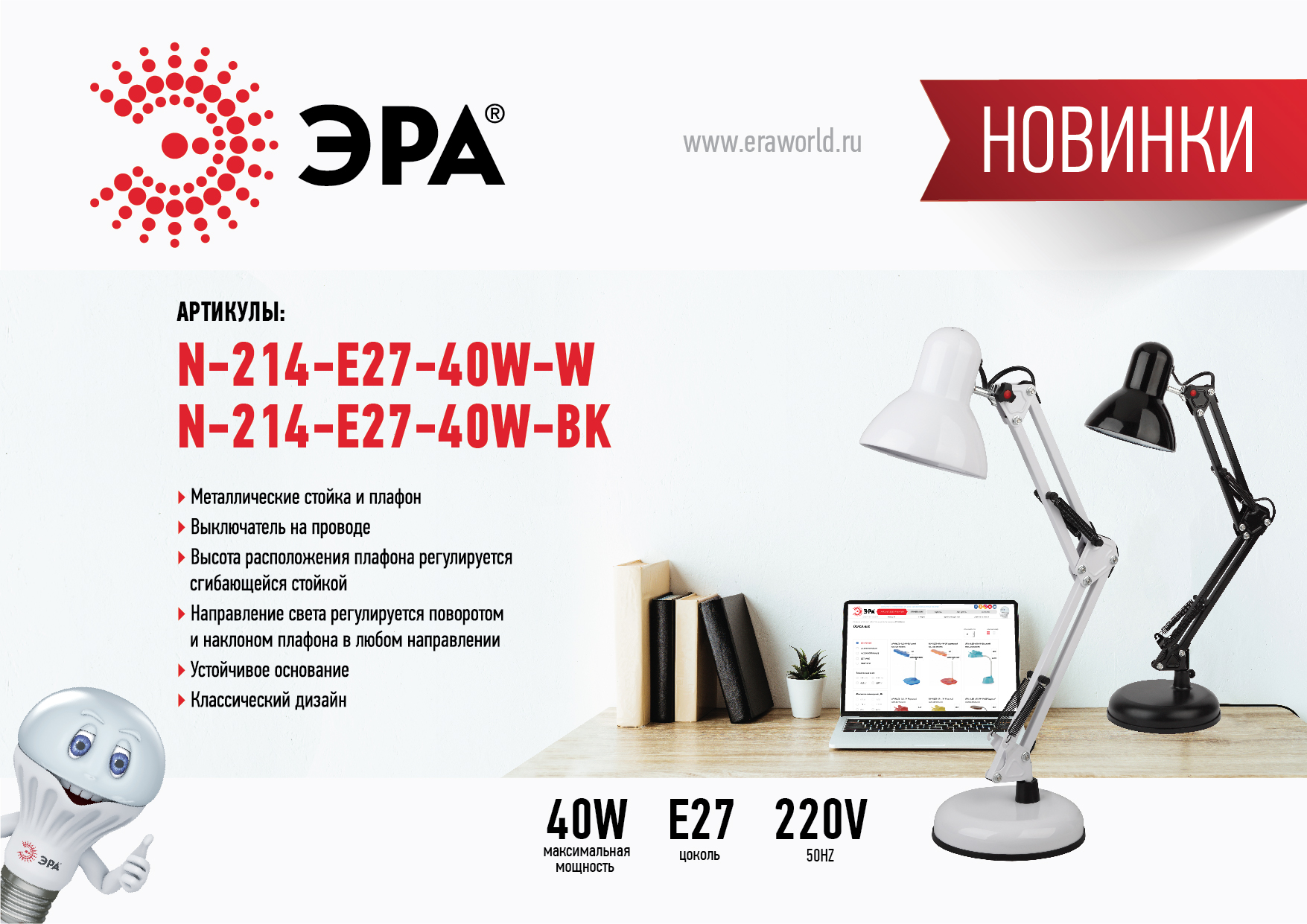 Настольный светильник ЭРА N-214-E27-40W-W классического дизайна может использоваться с разными источниками света - лампой накаливания, компактной люминесцентной лампой (КЛЛ) или светодиодной (LED) лампой. Выключатель на проводе. Устойчивое основание. Высота плафона регулируется двухсекционной сгибающейся стойкой, направление света - поворотом и наклоном плафона в любом направлении.