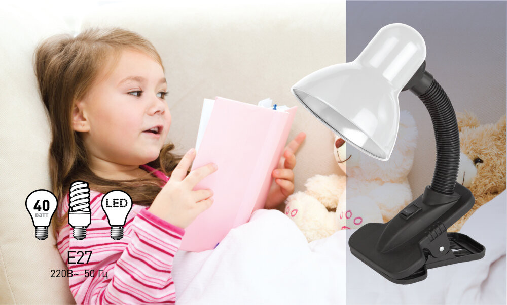 Металлический плафон. Направление света регулируется гибкой стойкой, которая обеспечивает наклон и поворот плафона в любом направлении. Выключатель на прищепке. Классический дизайн.Предназначен для использования с лампой накаливания или компактной люминесцентной лампой (КЛЛ): максимальная мощность 40W, цоколь E27, 220V 50HZ, лампа в комплект не входит.