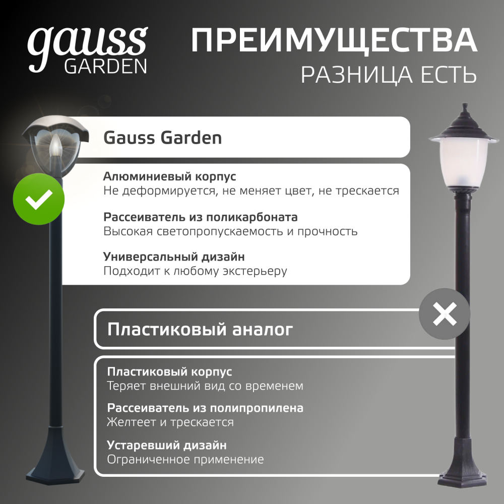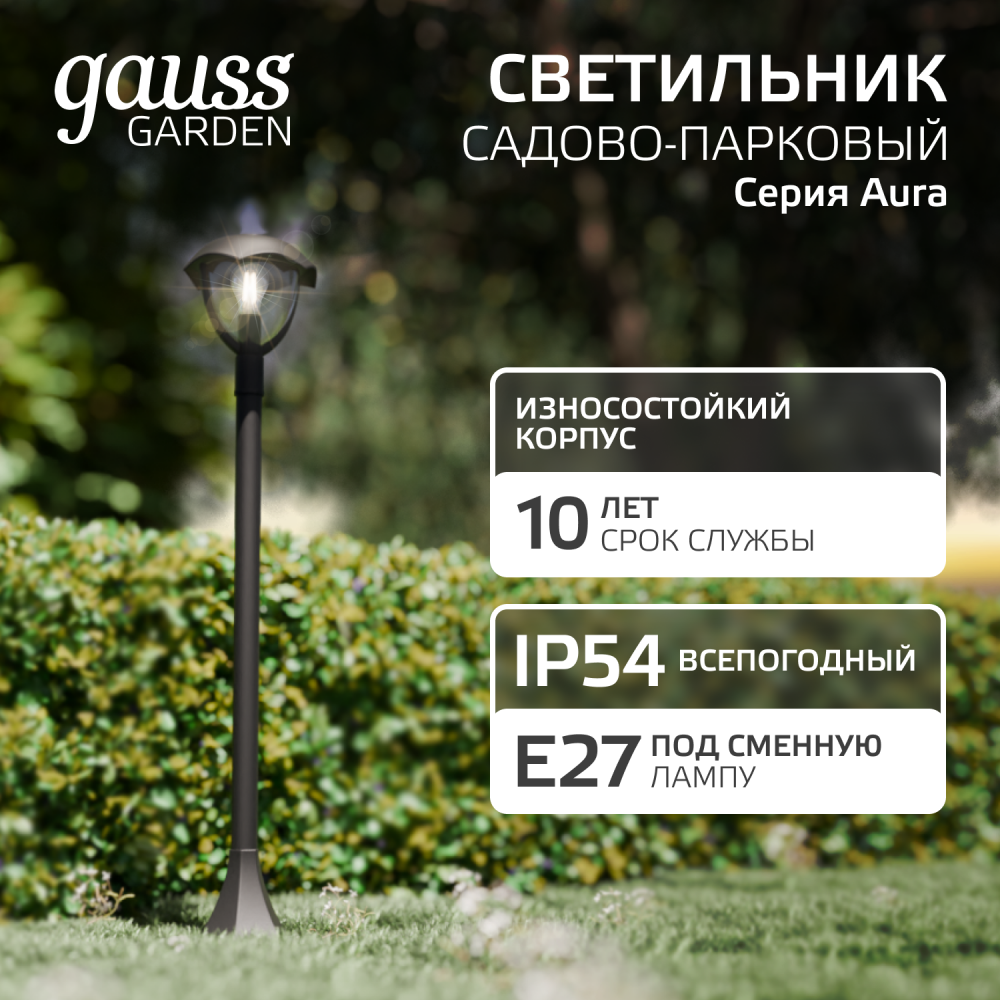 Садово-парковые светильники Gauss серии Aura в виде столбика прекрасно дополнят дизайн вашего пространства, а также создадут уютную атмосферу старинного парка. Помимо декоративной составляющей в придании эстетичности и завершенности архитектурной композиции участка, светильники серии Aura помогают ориентироваться в пространстве в ночное время суток, выполняя задачу общего освещения. Высокая пыле и влагонепроницаемость IP54, а также рассеиватель из прочного пластика позволит использовать светильник на открытых пространствах. Такие светильники Sonata способны работать в любой сезон при высоких и низких температурах в диапазоне от -40 до +50 градусов. Обеспечьте не только безопасное передвижение по участку в темное время суток, но и неповторимый образ вашего сада, за счет игры света и теней, с помощью садово-парковых светильников Gauss серии Aura.
