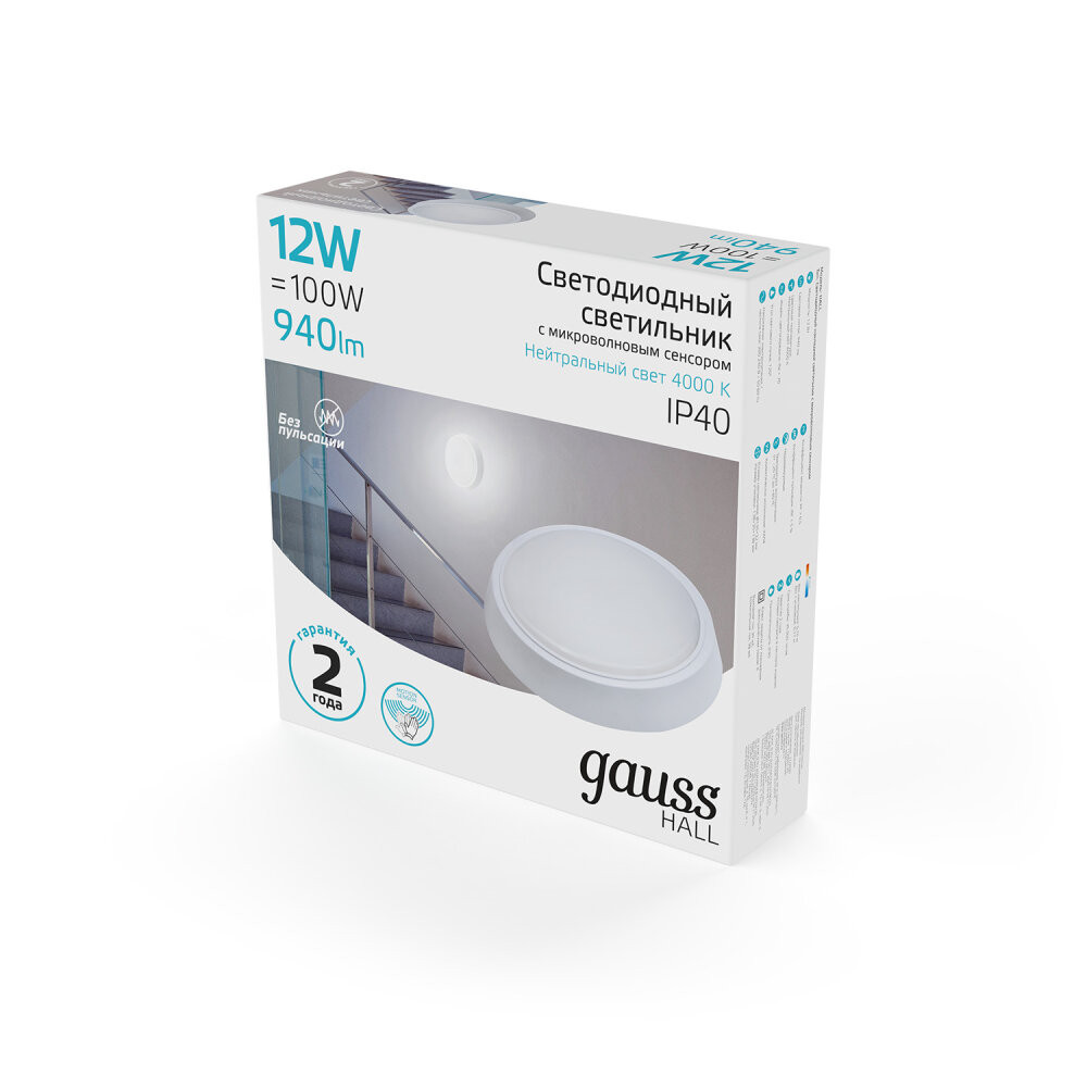 Полное описание товара Светильник светодиодный ДБП 12 Вт 940 лм 4000К AC 220В Белый IP40 круг D135х32мм Пластик ЖКХ с оптико-микроволновым датчиком движения HALL (GAUSS) 193411212-S