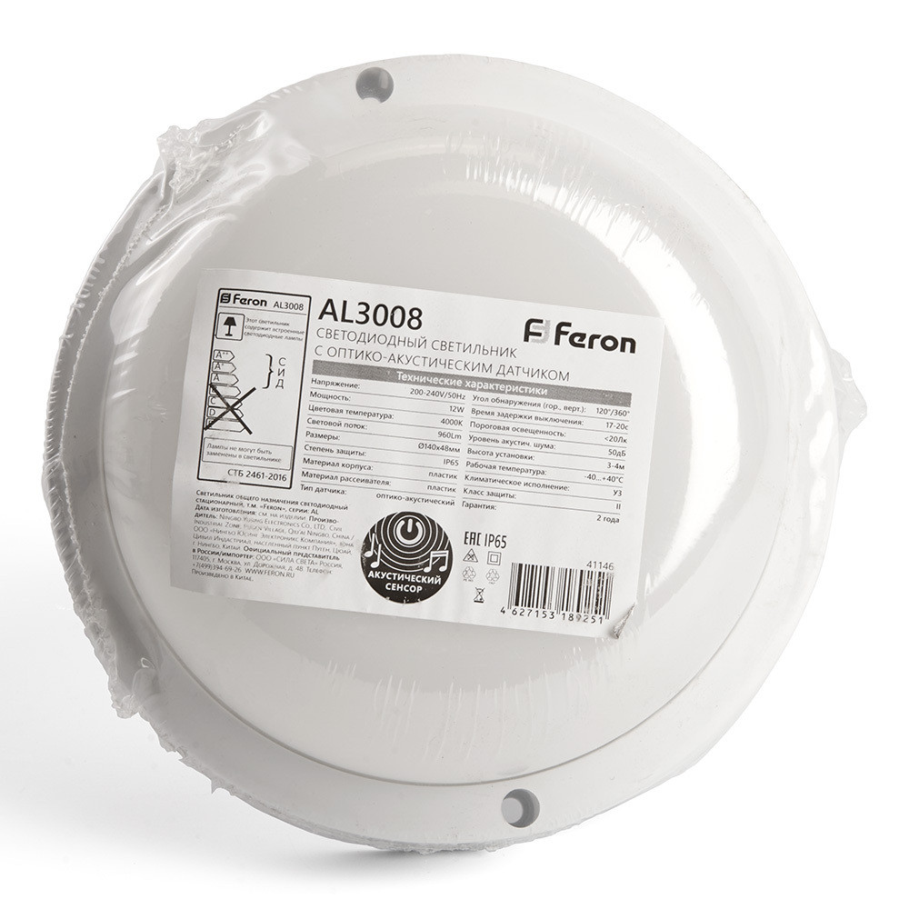 Светильник светодиодный ДБП-12w с оптико-акустическим датчиком 4000К 960Лм IP65 круглый белый (FERON) AL3008 41146