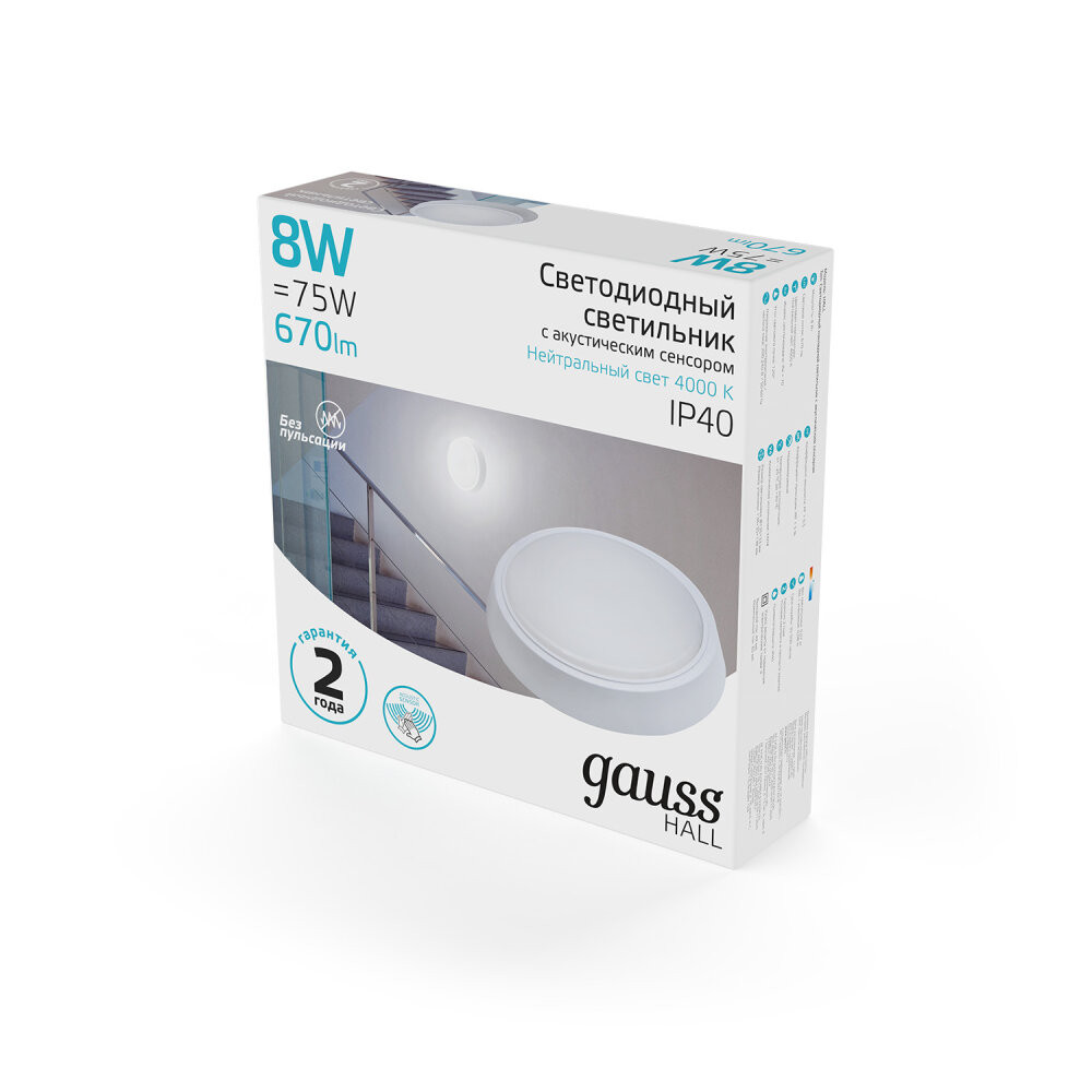 Полное описание товара Светильник светодиодный ДБП 8 Вт 670 лм 4000К AC 220В Белый IP40 круг D135х33мм Пластик ЖКХ с оптико-акустическим датчиком HALL (GAUSS) 193411208-OAS