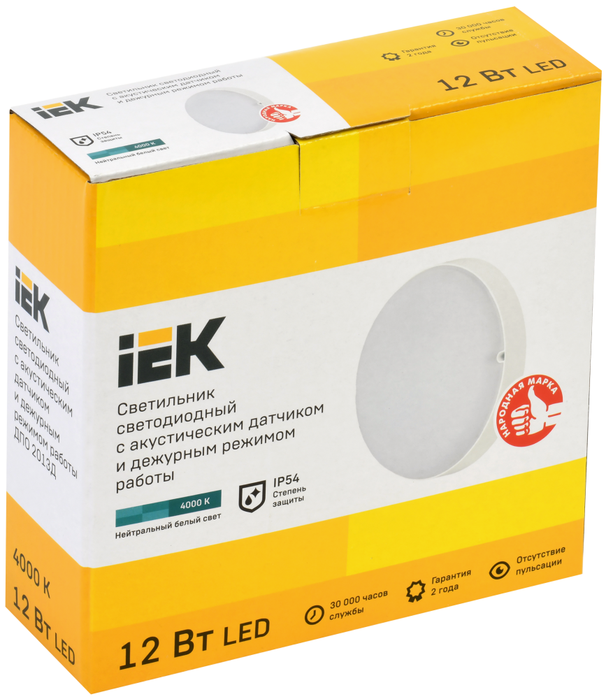 Полное описание товара Светильник светодиодный ДПО 2013Д 12Вт IP54 4000К дежурный режим круг белый с акустическим датчиком (IEK) LDPO3-2013D-12-4000-K01