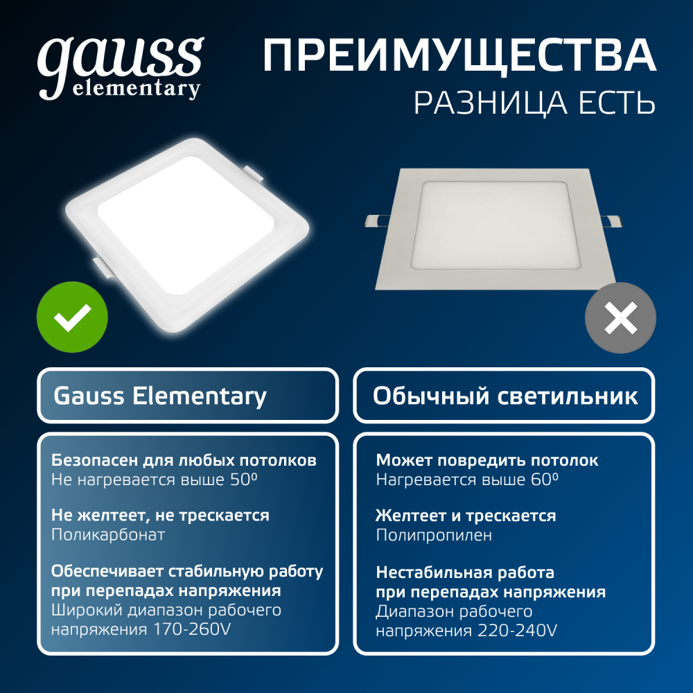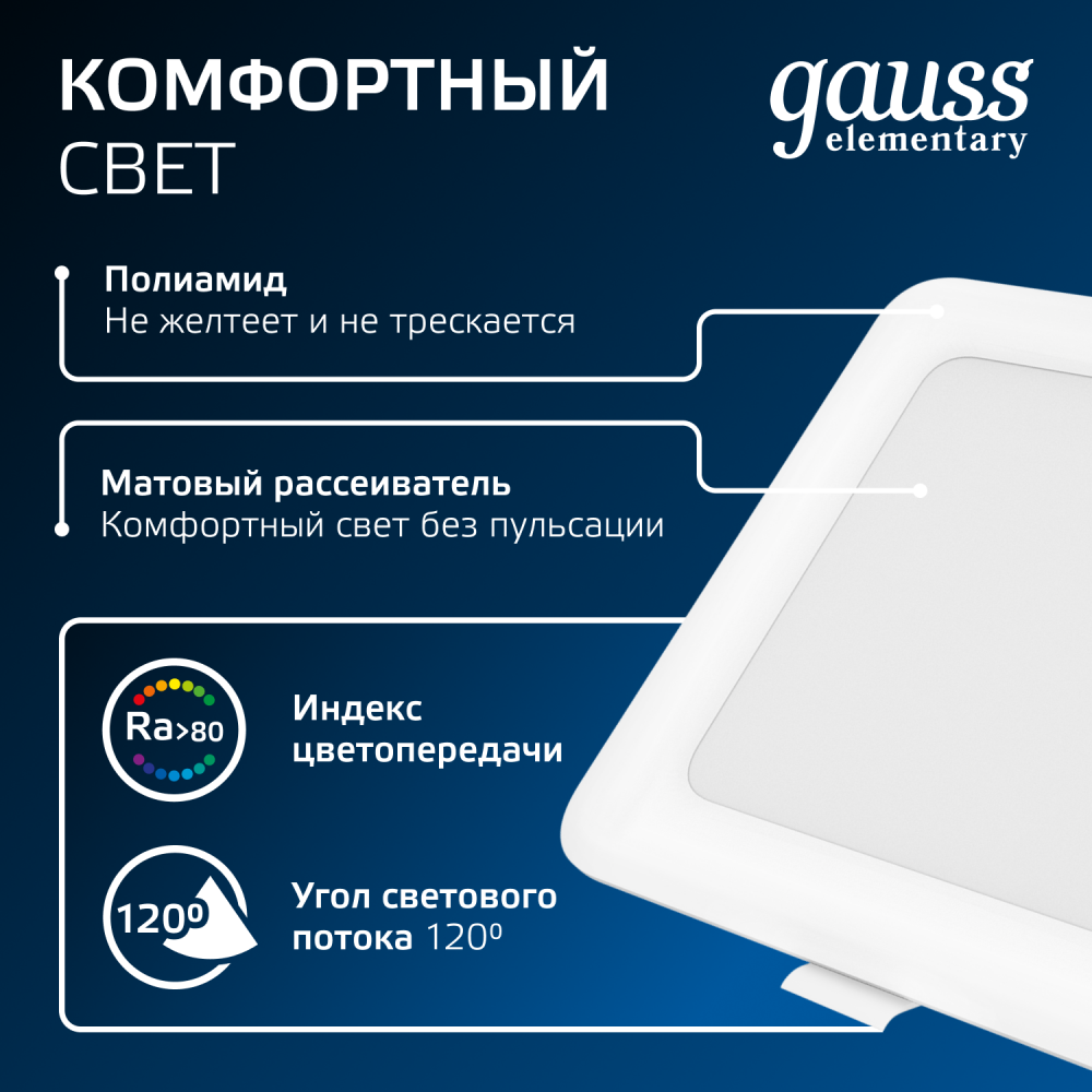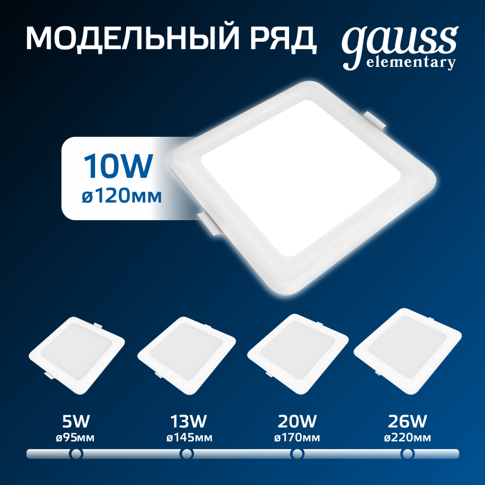 Полное описание товара Светильник светодиодный ДВО 10 Вт 780 лм 4000К AC 220В IP20 квадрат 120х120х26мм монт разм 90х90мм Пластик Elementary (GAUSS) 998420209