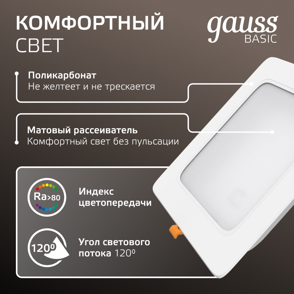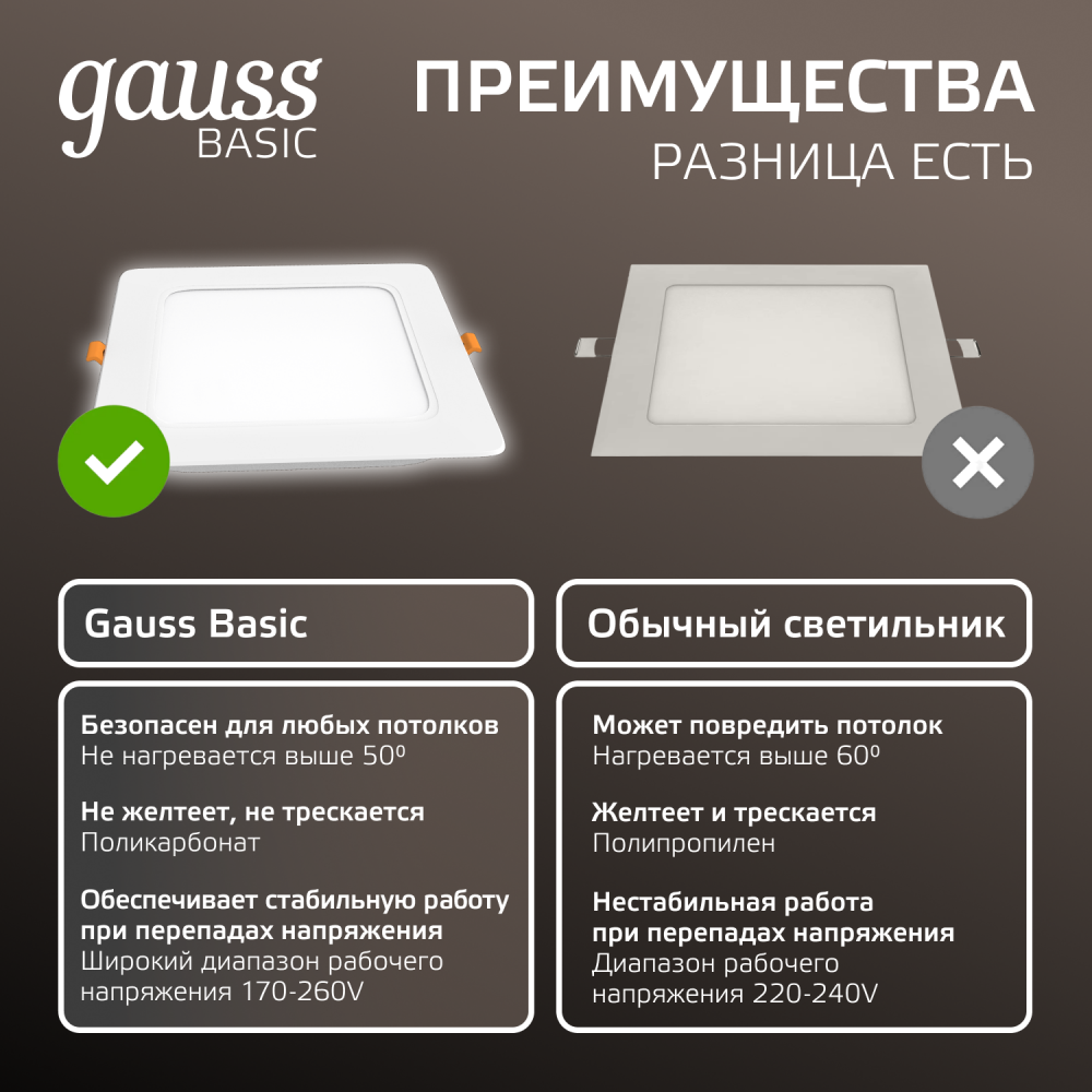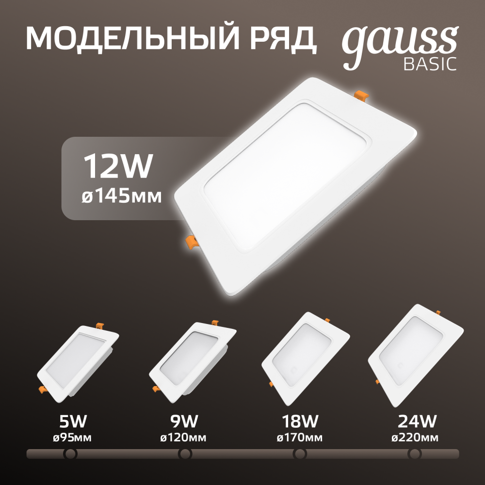 Полное описание товара Светильник светодиодный ДВО 12 Вт 1000 лм 4000К AC 220В IP20 квадрат 145х145х26мм монт разм 120х120мм Пластик Basic (GAUSS) 9031420212