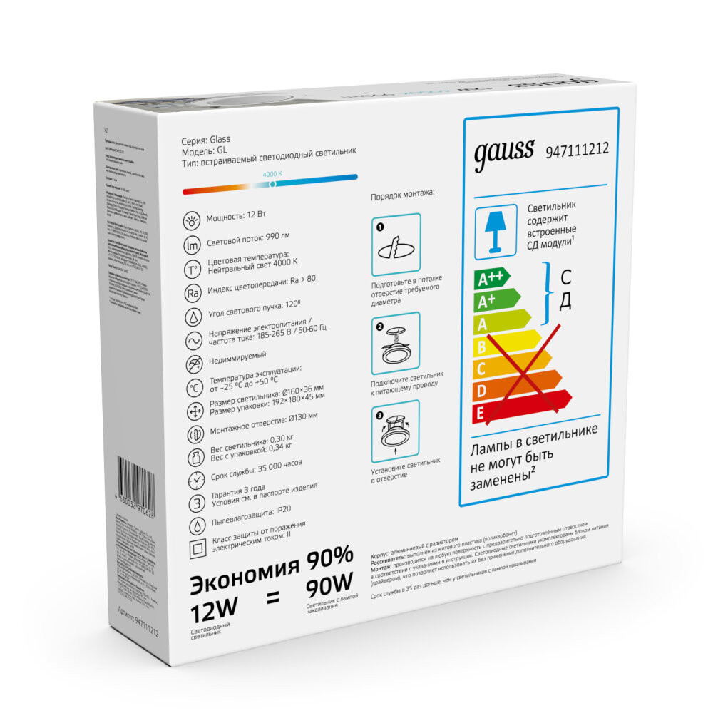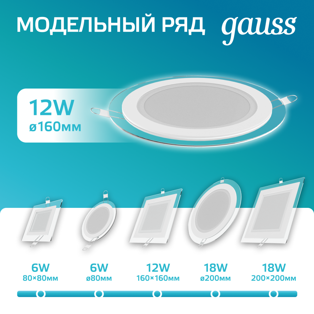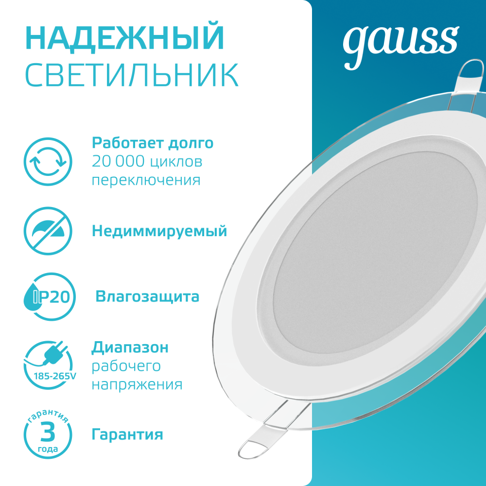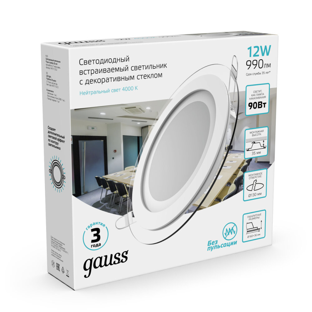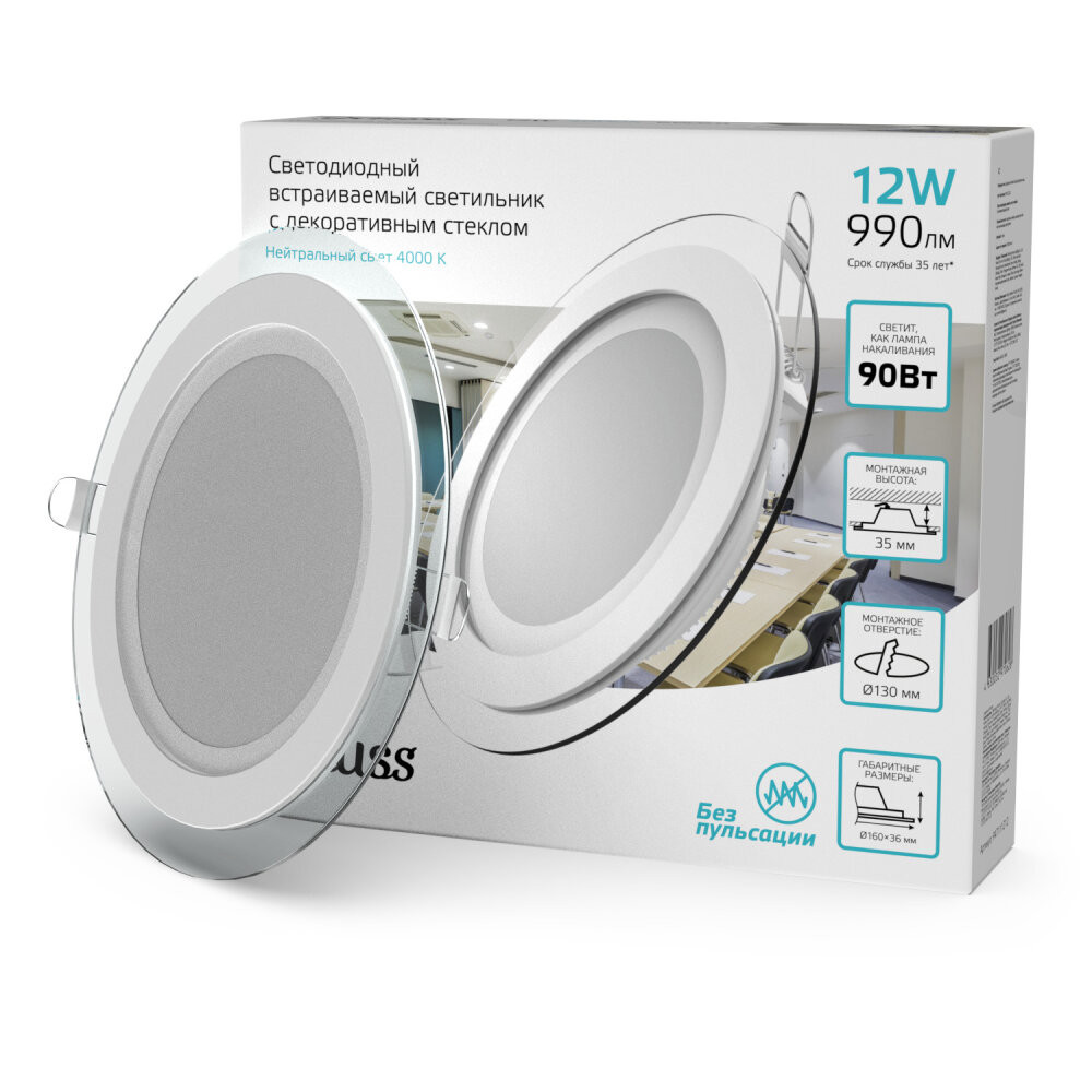 Полное описание товара Светильник светодиодный ДВО 12 Вт 990 лм 4000К AC 220В IP20 круг D160х36мм монт d118мм Алюминий с декоративным стеклом Glass (GAUSS) 947111212