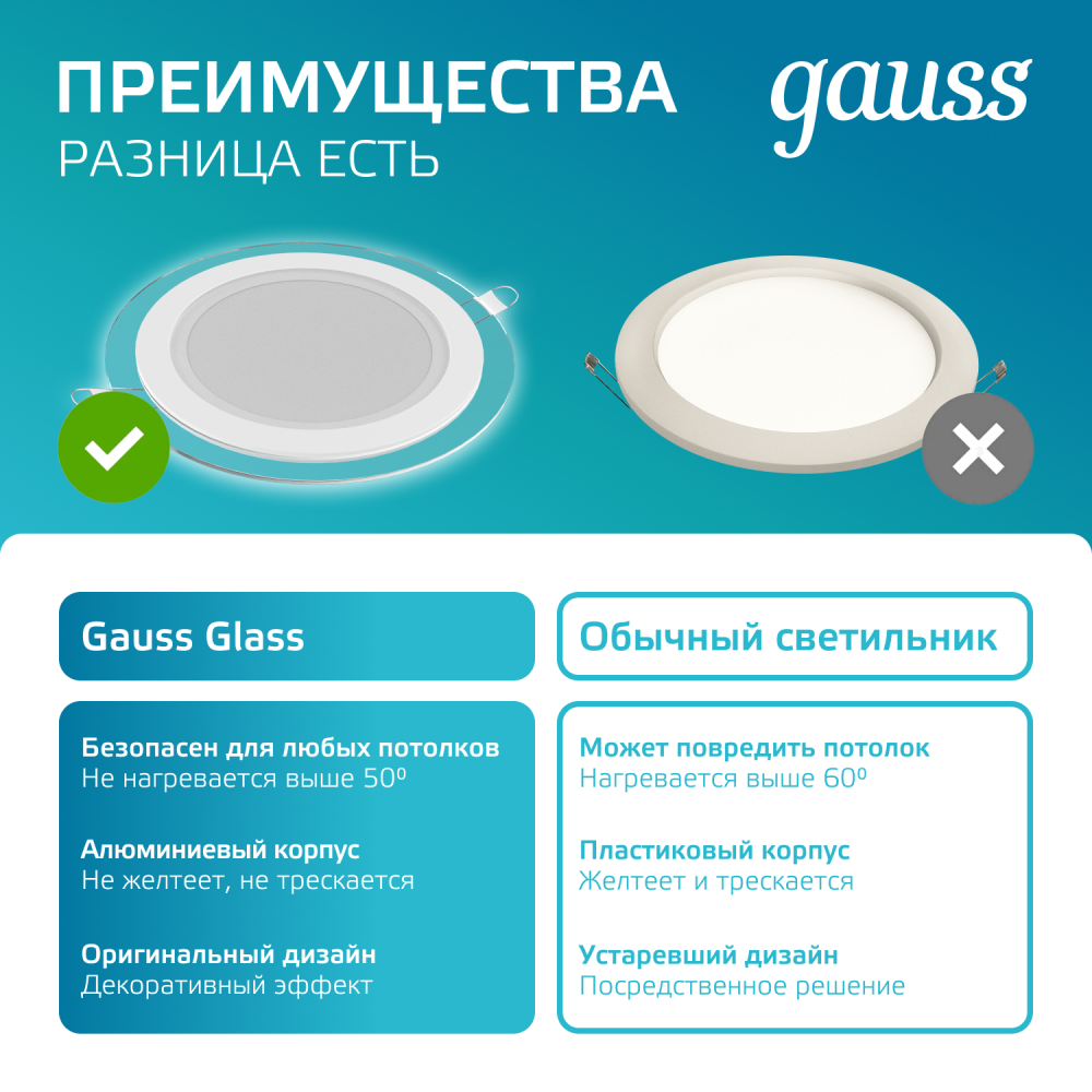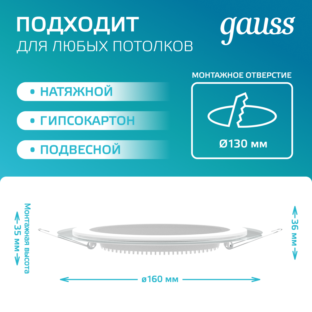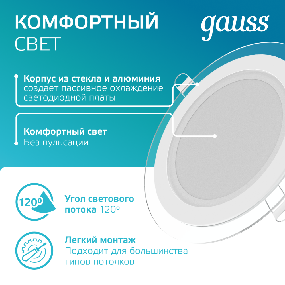 Светильники с декоративным стеклом от Gauss обеспечивают комфортное и экономичное освещение в помещениях разного назначения. Такие потолочные светодиодные светильники обладают лаконичным дизайном и компактными размерами, поэтому гармонично впишутся в любой интерьер. Эти осветительные приборы можно использовать при монтаже любых натяжных конструкций, создавая желаемую атмосферу в помещении. Светильники с декоративным стеклом от Gauss идеально подходят в качестве дополнительного или акцентного освещения на кухнях, в гостиных, санузлах, для выделения объектов на витринах магазинов, в кафе или других коммерческих учреждениях. При создании разноуровневых конструкций с точечным светодиодным освещением можно визуально увеличить пространство в помещении, создать нужную атмосферу для работы или отдыха.