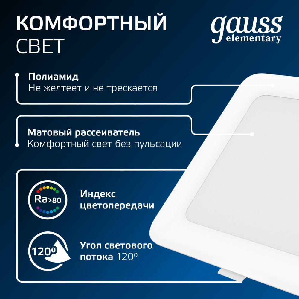 Полное описание товара Светильник светодиодный ДВО 13 Вт 1100 лм 4000К AC 220В IP20 квадрат 145х145х26мм монт разм 120х120мм Пластик Elementary (GAUSS) 998420212