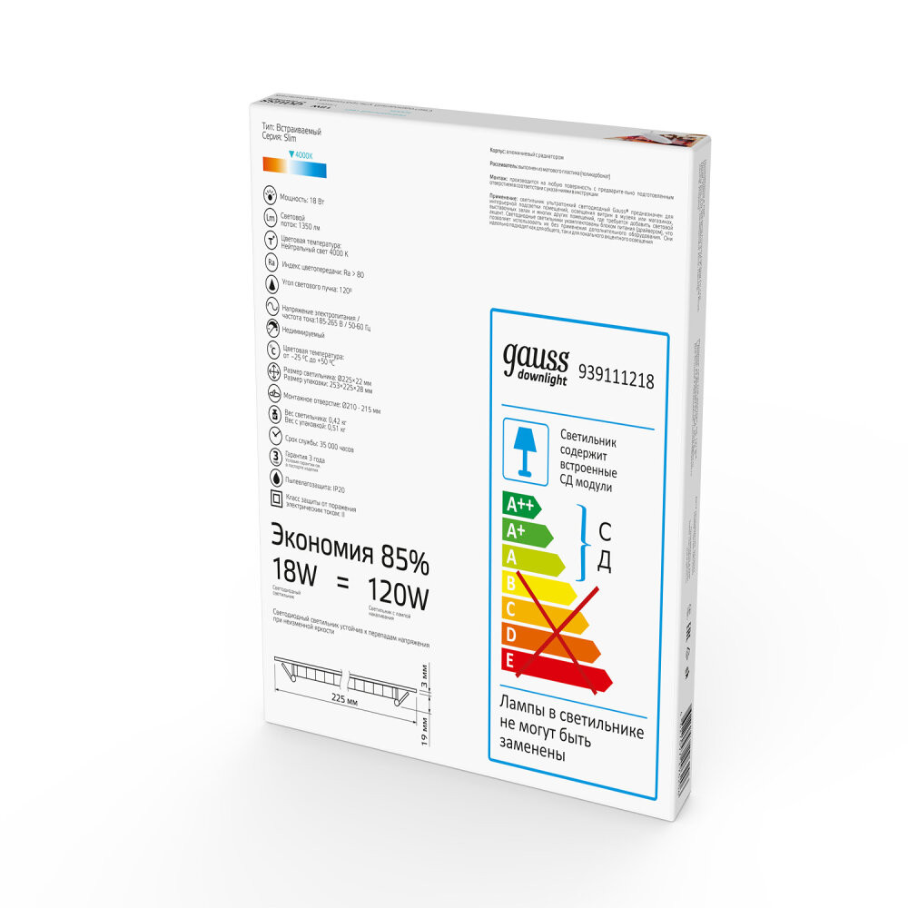 Полное описание товара Светильник светодиодный ДВО 18 Вт 1350 лм 4000К AC 220В IP20 круг D225х22мм монт d210мм Алюминий тонкий Slim Gauss (GAUSS) 939111218