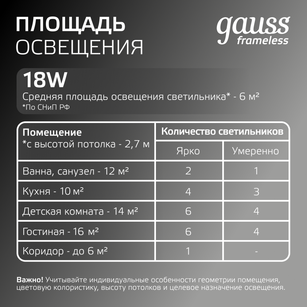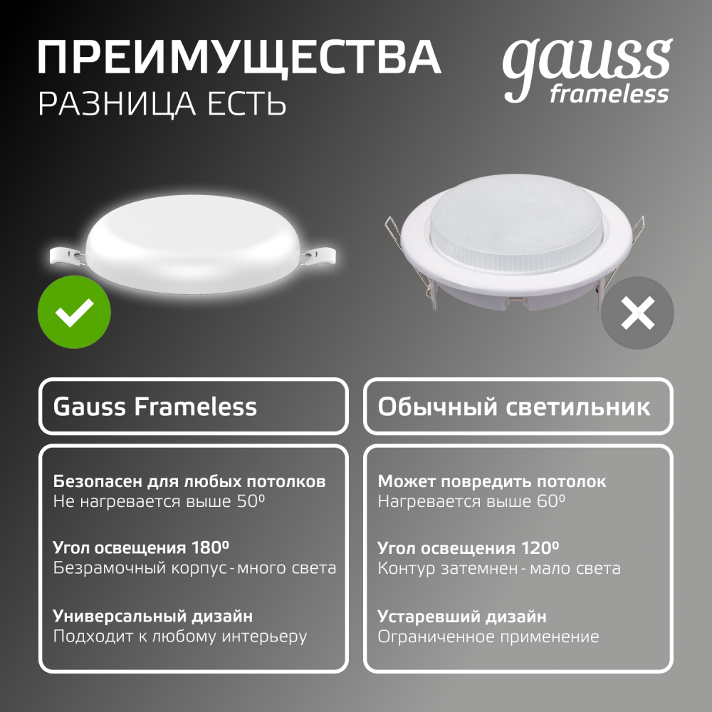 С помощью светильников Frameless от Gauss можно придать интерьеру неповторимый стиль и оригинальность. Потолочные светильники cерии Frameless могут заменить люстру, либо служить в качестве дополнительного источника освещения. Преимущества данной линейки: Монтаж возможен в любые встраиваемые потолочные поверхности, Широкий ассортимент мощностей, Правильное размещение светильников Frameless позволяет добиться равномерной освещенности всего пространства, оптимизировать расходы на электроэнергию и даже визуально увеличить объем помещения. Потолочные светильники Frameless прекрасно подойдут в качестве основного источника освещения в спальнях, прихожих и ванных комнатах.