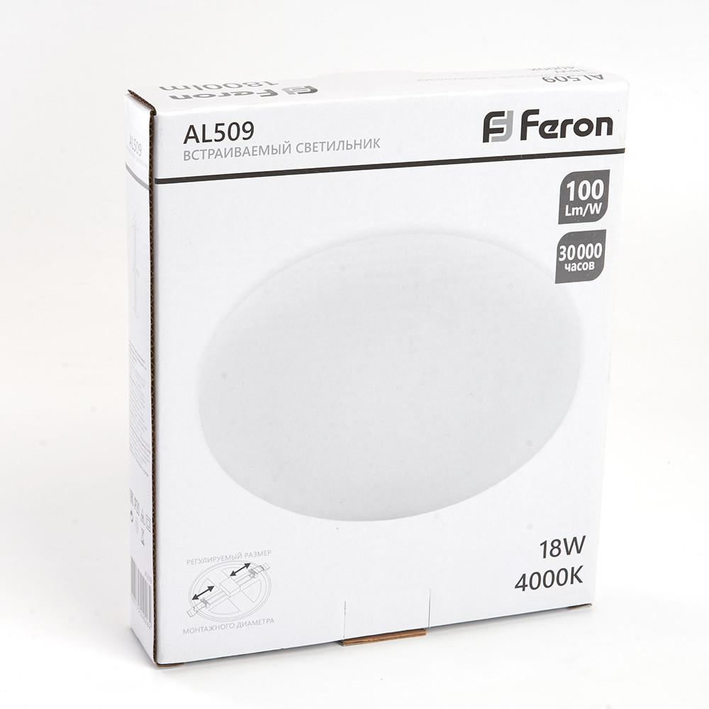 Полное описание товара Светильник светодиодный ДВО-18w 4000К 1800Лм slim белый с регулируемым монтажным диаметром (до 130мм) (FERON) AL509 41209